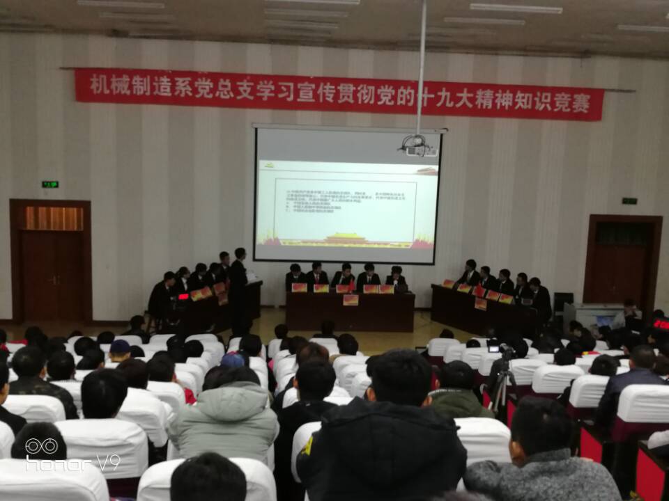 為進(jìn)一步深入學(xué)習(xí)宣傳貫徹黨的十九大精神,幫助廣大師生準(zhǔn)確理解把握黨的十九大提出的新思想、新論斷、新目標(biāo)、新要求,堅(jiān)持用習(xí)近平新時(shí)代中國(guó)特色社會(huì)主義思想武裝頭腦、穩(wěn)步推動(dòng)各項(xiàng)工作。12月21日,機(jī)械制造系黨總支在正德廳舉行學(xué)習(xí)貫徹十九大精神知識(shí)競(jìng)賽。