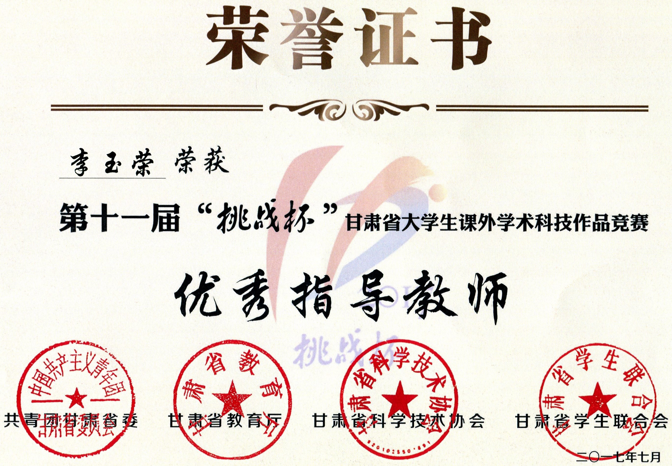 第十一屆“挑戰(zhàn)杯”甘肅省大學(xué)生課外學(xué)術(shù)科技作品競賽“優(yōu)秀指導(dǎo)教師”