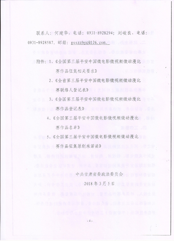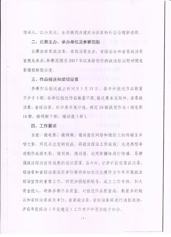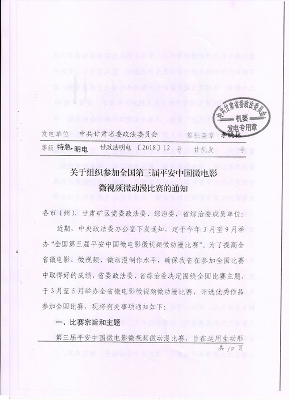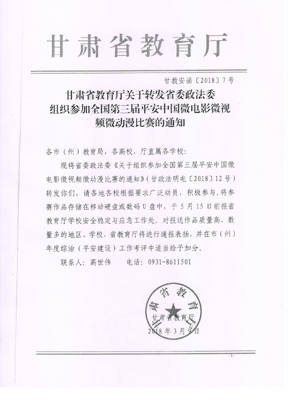 現將甘肅省教育廳關于轉發(fā)《省委政法委<關于組織參加全國第三屆平安中國微電影微視頻微動漫比賽的通知>》(甘政法明電〔2018〕12號)轉發(fā)你們,請各部門、單位根據要求廣泛動員,積極參與。將參賽作品存儲在移動硬盤或數碼U盤中,于5月10日前報宣傳統(tǒng)戰(zhàn)部辦公室,宣傳統(tǒng)戰(zhàn)部對報送作品匯總后統(tǒng)一報送省教育廳。