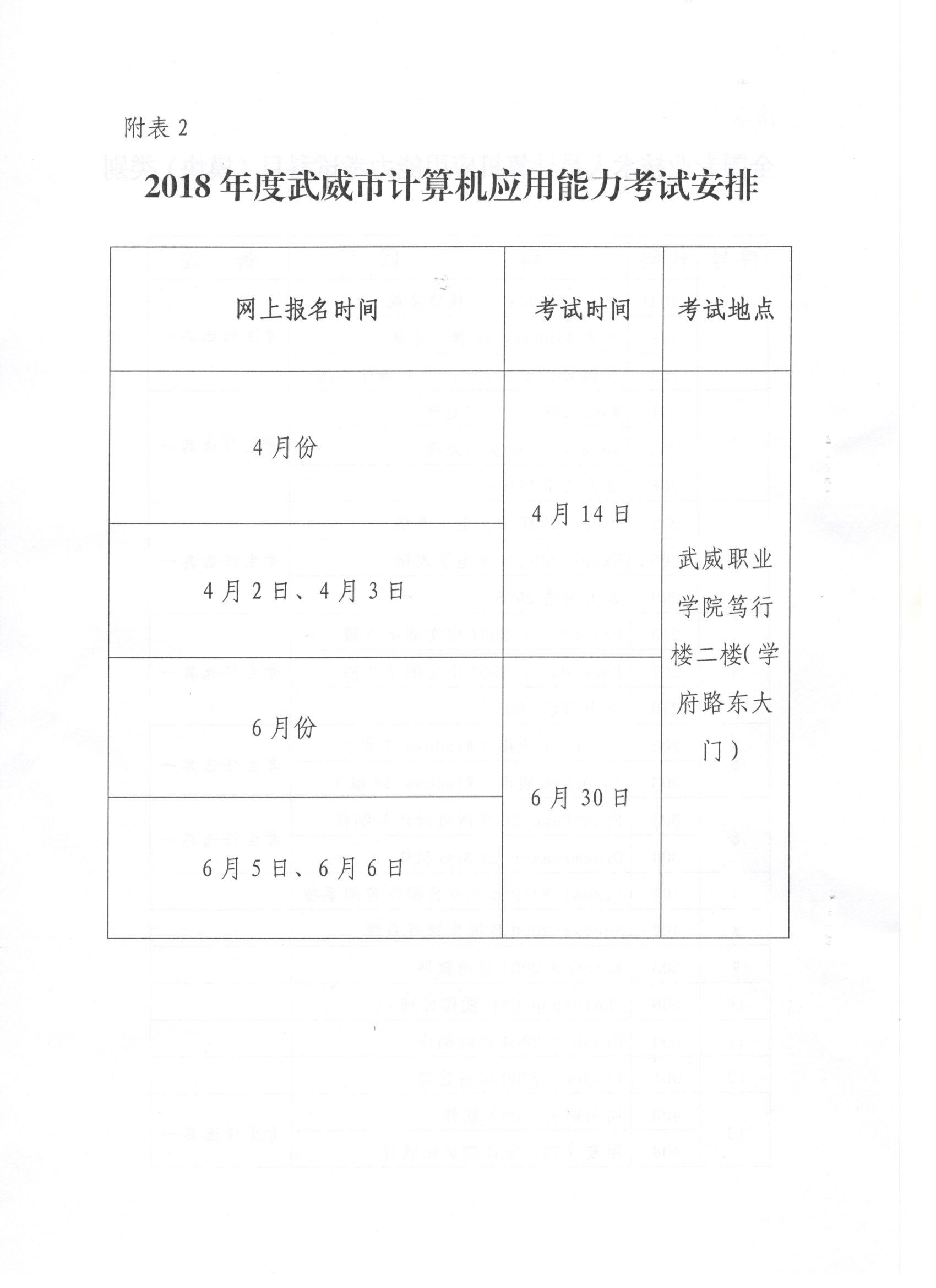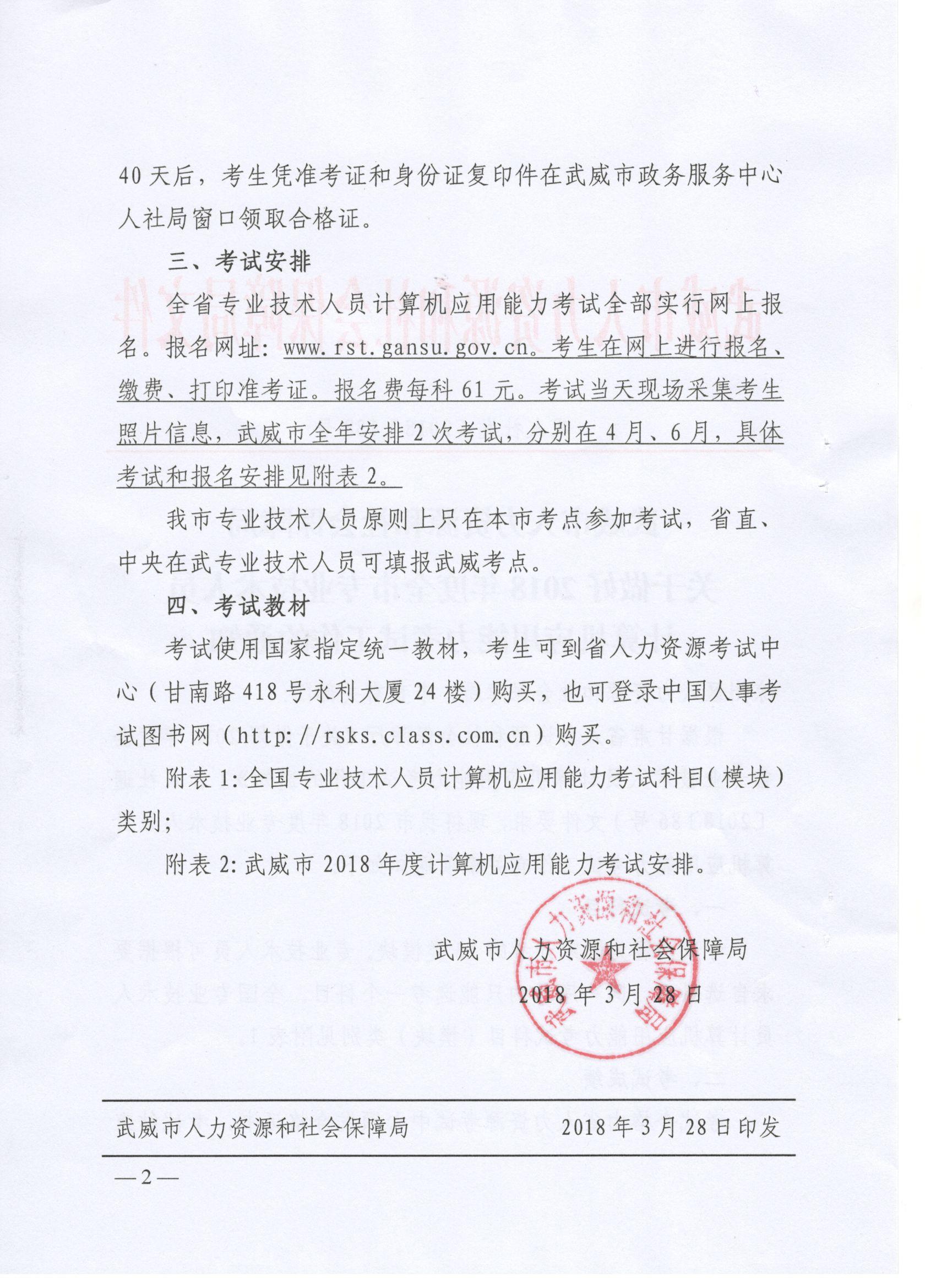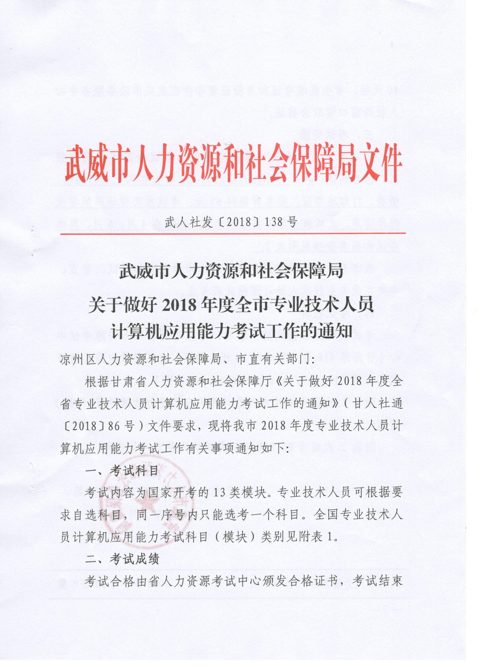 <轉(zhuǎn)>武威市人力資源和社會(huì)保障局關(guān)于做好2018年度全市專(zhuān)業(yè)技術(shù)人員計(jì)算機(jī)應(yīng)用能力考試工作的通知(武人社發(fā)〔2018〕138號(hào) )
