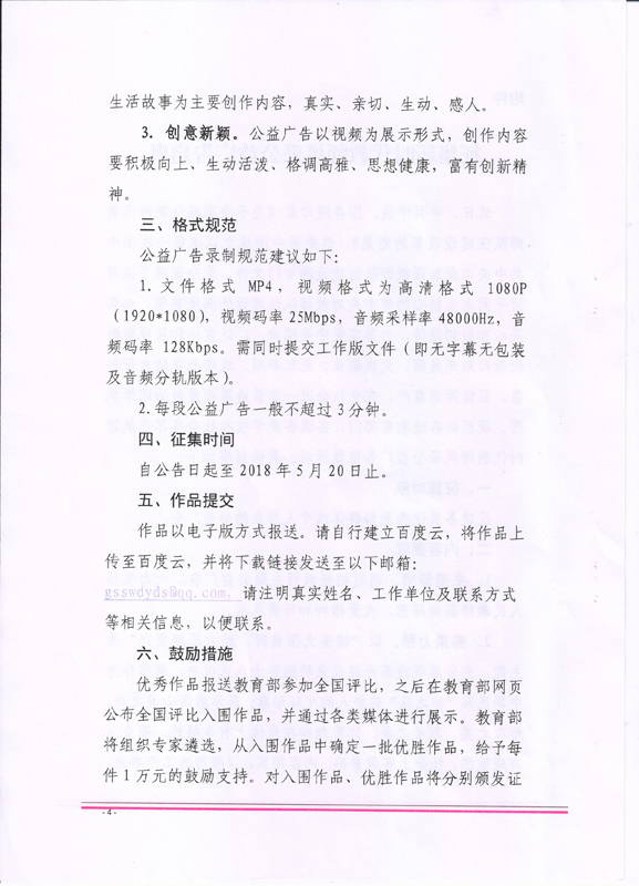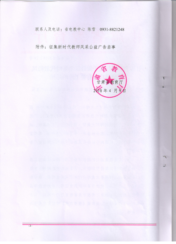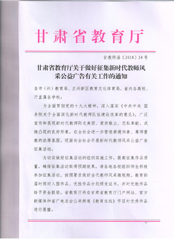 ???? 現(xiàn)將甘肅省教育廳《甘肅省教育廳關(guān)于做好征集新時(shí)代教師風(fēng)采公益廣告有關(guān)工作的通知》(甘教師函〔2018〕24號(hào))轉(zhuǎn)發(fā)你們,請(qǐng)各部門、單位根據(jù)通知要求認(rèn)真組織,積極參與。將參賽作品于5月15日前報(bào)宣傳統(tǒng)戰(zhàn)部辦公室,宣傳統(tǒng)戰(zhàn)部對(duì)報(bào)送作品匯總后統(tǒng)一報(bào)送省教育廳電教中心。