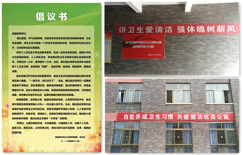 學(xué)院面向全體同學(xué)發(fā)出倡議,并在教學(xué)樓、公寓樓粘貼了倡議書,倡議全體同學(xué)養(yǎng)成良好的個(gè)人衛(wèi)生習(xí)慣,自覺做到“四勤”:勤洗手腳、勤洗澡、勤剪指甲、勤換洗衣服;保持宿舍干凈整潔,及時(shí)清理垃圾、勤換洗床單被罩、室內(nèi)多通風(fēng)換氣、地面桌面擦洗干凈、舍友之間相互關(guān)心幫助,把宿舍營造得既有家的舒適,又有家的溫暖;自覺維護(hù)和參與整治公共環(huán)境衛(wèi)生,從路遇垃圾順手撿起、上完廁所及時(shí)沖水、食品袋不要留在教室里等細(xì)小行為入手,躬親示范、感染他人,用自己的行動(dòng)打造清新、潔凈、靚麗的校園環(huán)境,無愧于“大學(xué)生”的稱謂。學(xué)院還在教學(xué)樓和公寓樓分別懸掛了“講衛(wèi)生愛清潔強(qiáng)體魄樹新風(fēng)”、“自覺養(yǎng)成衛(wèi)生習(xí)慣 共建整潔優(yōu)美公寓”等內(nèi)容的宣傳條幅。