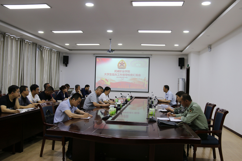 6月14日上午,由武威軍分區(qū)副司令員丁全綱帶隊(duì),市教育局督學(xué)張應(yīng)偉、涼州區(qū)人武部政委丁俊強(qiáng)、涼州區(qū)人武部副部長(zhǎng)韓小偉、涼州區(qū)西關(guān)街武裝部部長(zhǎng)趙光慶一行5人到我院督導(dǎo)檢查征兵工作,學(xué)院副院長(zhǎng)田迎春、學(xué)工處處長(zhǎng)王守云陪同檢查。各系黨總支書記、輔導(dǎo)員參加了匯報(bào)會(huì),田迎春主持會(huì)議。