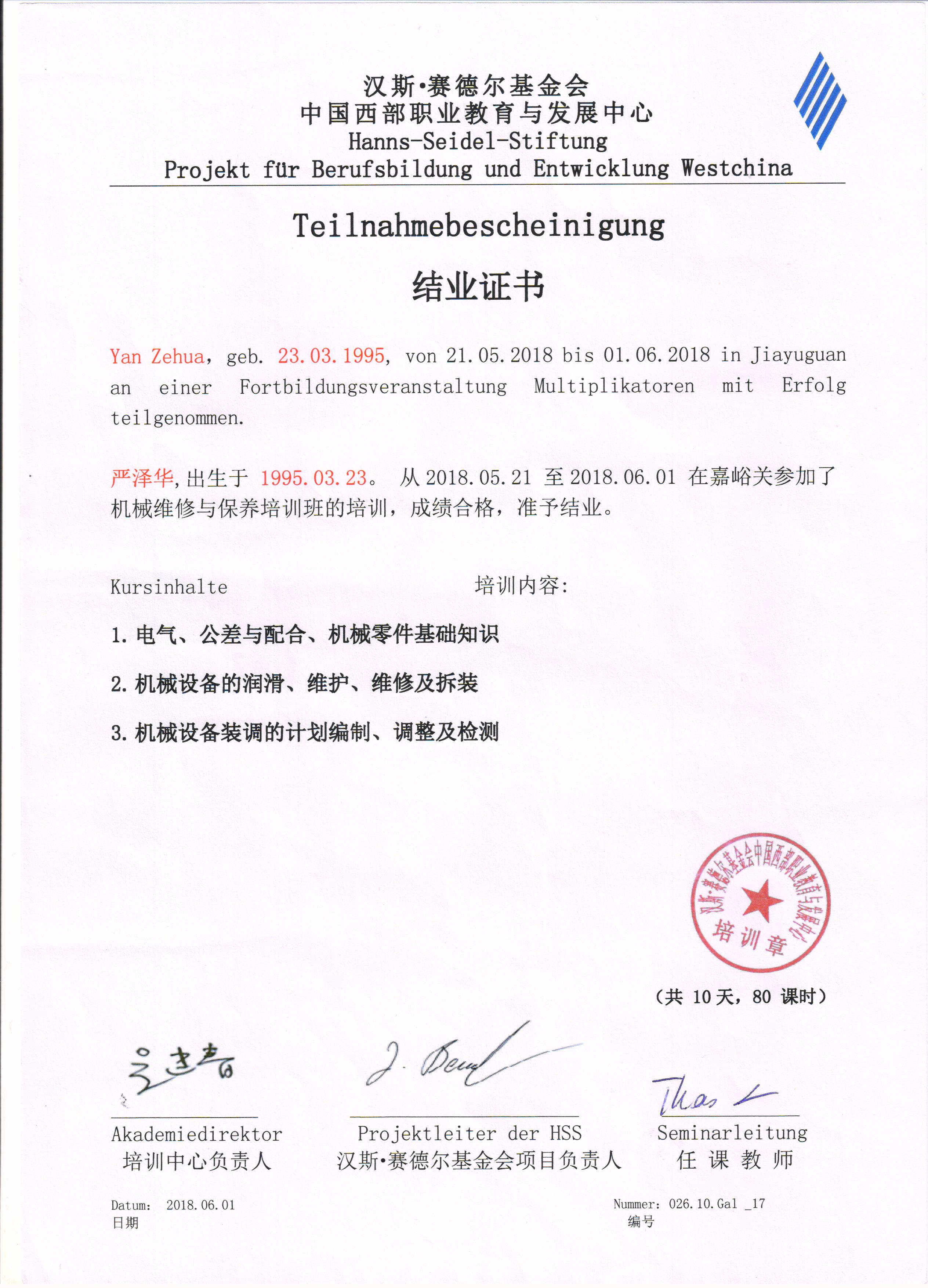 培訓(xùn)證書--參加漢斯·賽德爾基金會中國西部職業(yè)教育與發(fā)展中心培訓(xùn)