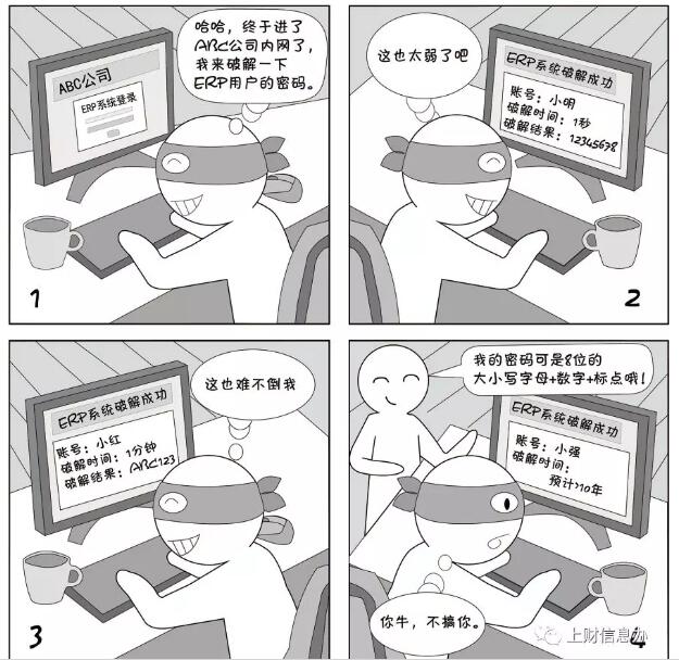 密碼越復(fù)雜,破解難度越高,而且這個(gè)比例是成指數(shù)級的,簡單6位數(shù)字密碼秒破,而8位復(fù)雜密碼的破解需要20年以上。