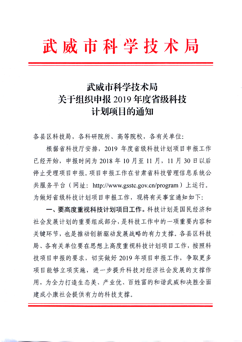 轉(zhuǎn)發(fā)武威市科學(xué)技術(shù)局關(guān)于組織申報(bào)2019年度省級(jí)科技計(jì)劃項(xiàng)目的通知