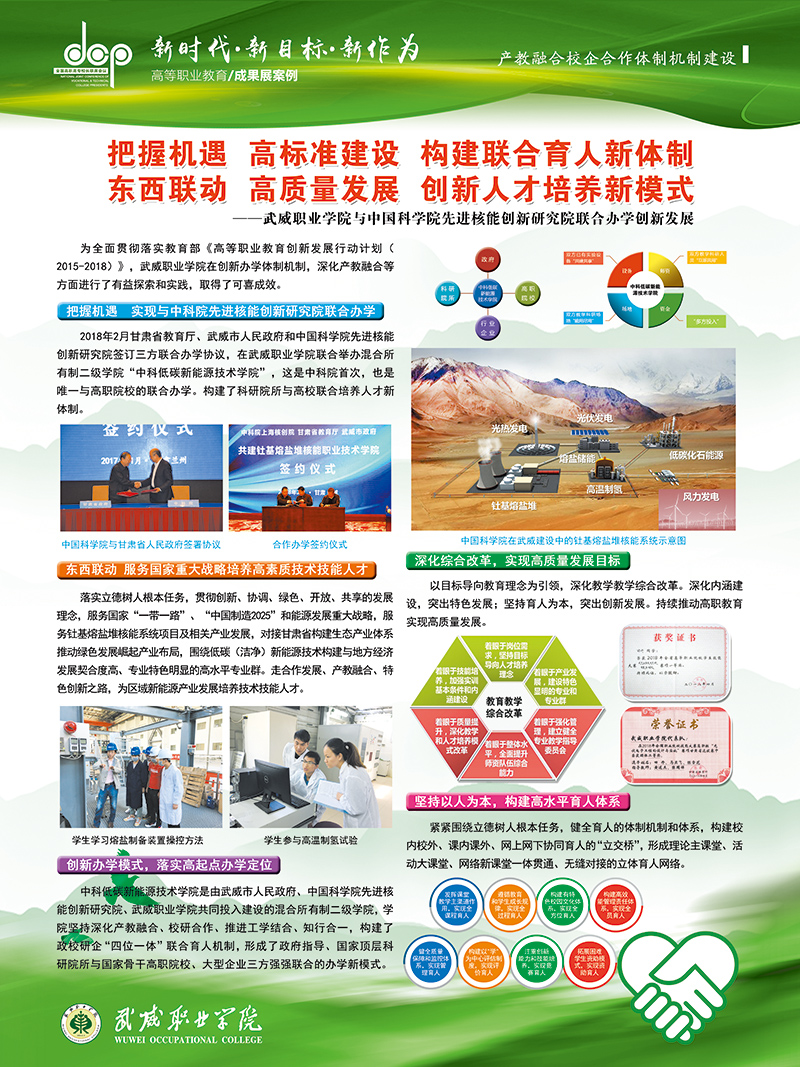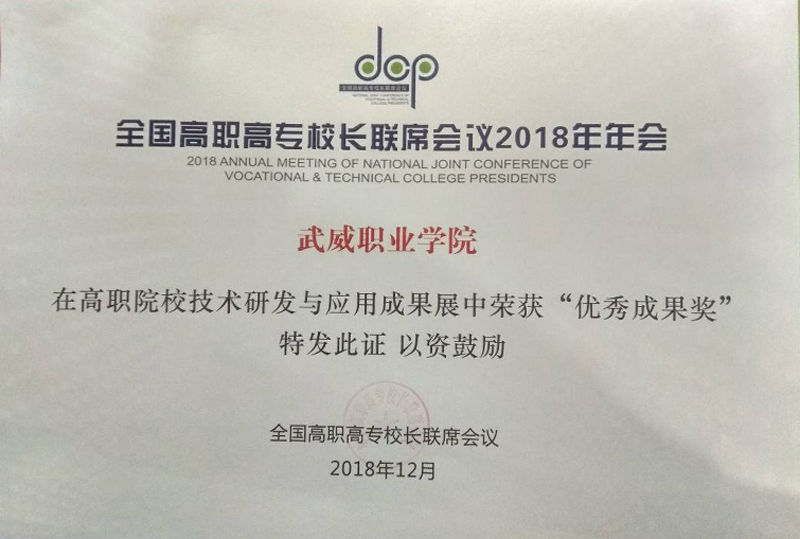 12月8日至9日,學(xué)院黨委書記、院長(zhǎng)趙明教授、副院長(zhǎng)翟存祥教授帶隊(duì)參加了在福建福州召開(kāi)的全國(guó)高職高專校長(zhǎng)聯(lián)席會(huì)議2018年年會(huì)。學(xué)院自主研發(fā)的“光伏組件智能清潔裝置”榮獲高職院校技術(shù)研發(fā)與應(yīng)用成果 “優(yōu)秀成果獎(jiǎng)”(全國(guó)僅36所高職院校獲此殊榮,甘肅省僅2所),“學(xué)院與中科院先進(jìn)核能創(chuàng)新研究院聯(lián)合辦學(xué)創(chuàng)新發(fā)展”案例入選教育成果案例展。
