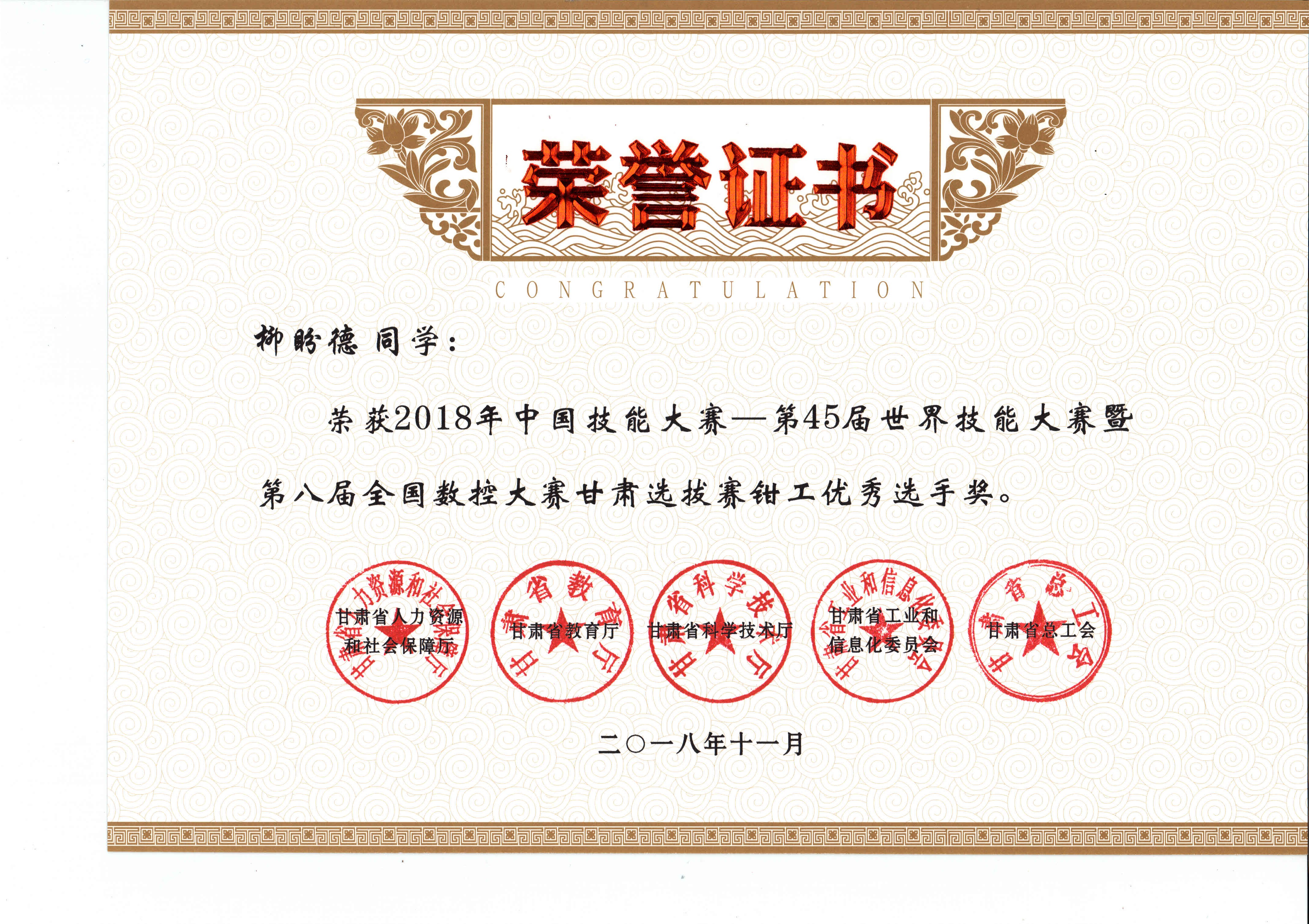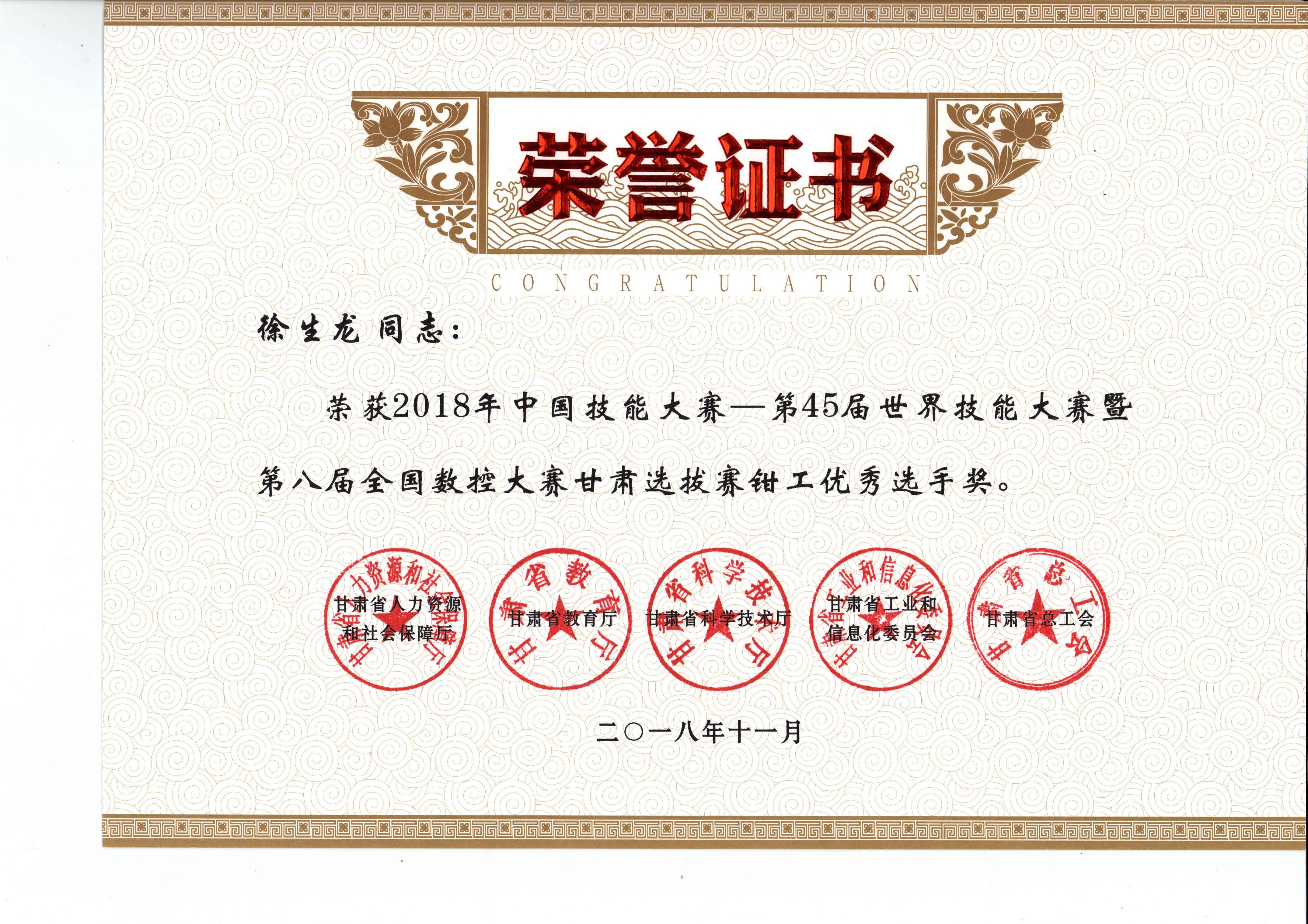 2018年中國技能大賽--第45屆世界技能大賽暨第八屆全國數(shù)控大賽甘肅選拔賽(鉗工項(xiàng)目)獲獎(jiǎng)證書
