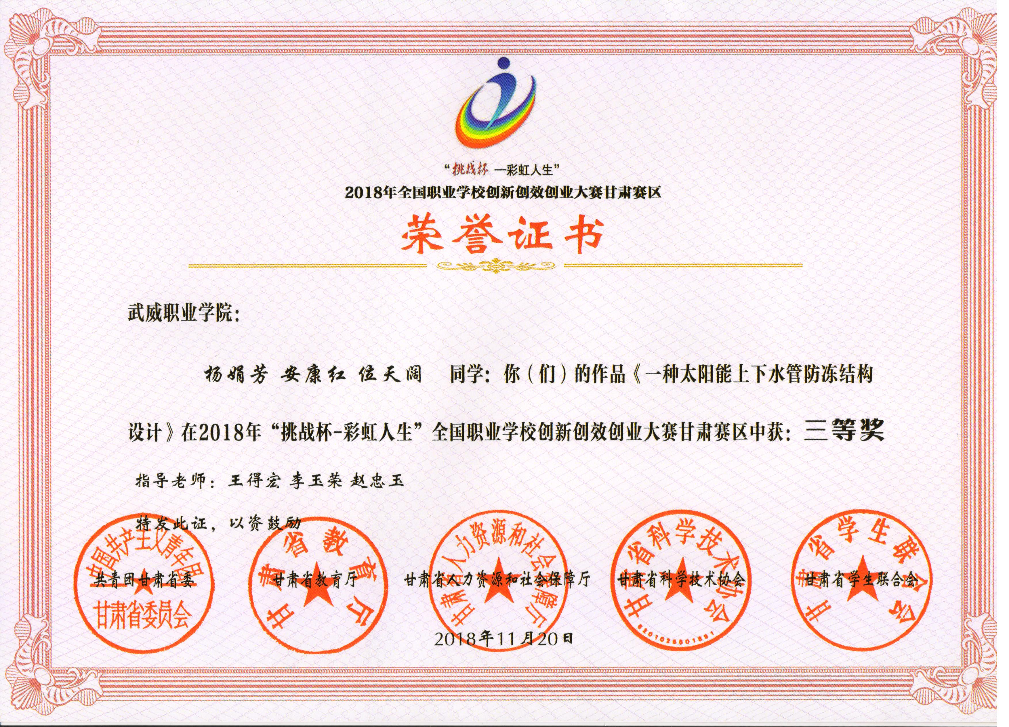 2018年“挑戰(zhàn)杯--彩虹人生”全國職業(yè)學(xué)校創(chuàng)新創(chuàng)效創(chuàng)業(yè)大賽甘肅賽區(qū)三等獎