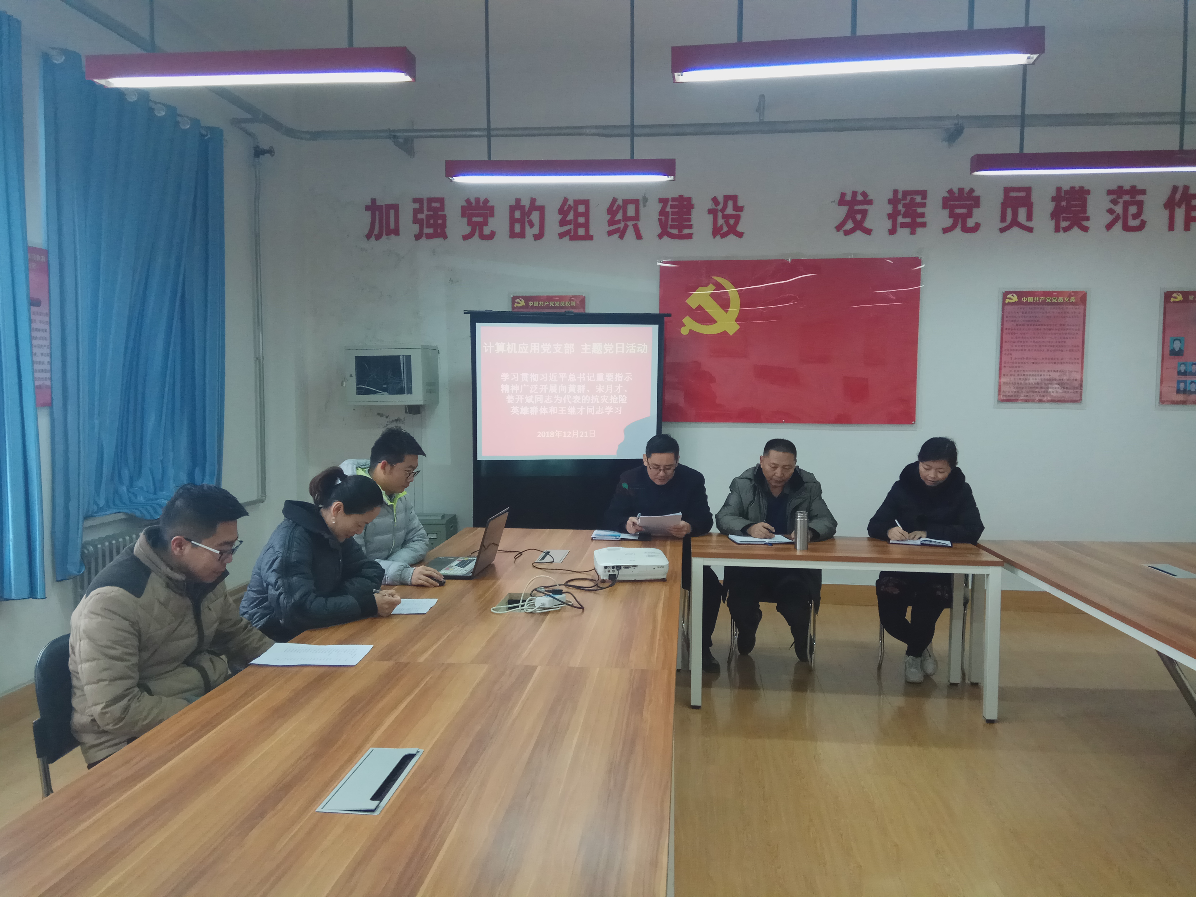 2018年12月21日,電子及網(wǎng)絡(luò)黨支部組織開展“不忘初心、牢記使命——學(xué)習(xí)全國、全省優(yōu)秀共產(chǎn)黨員先進事跡”主題黨日活動,電子及網(wǎng)絡(luò)黨支部全體黨員參加學(xué)習(xí)。