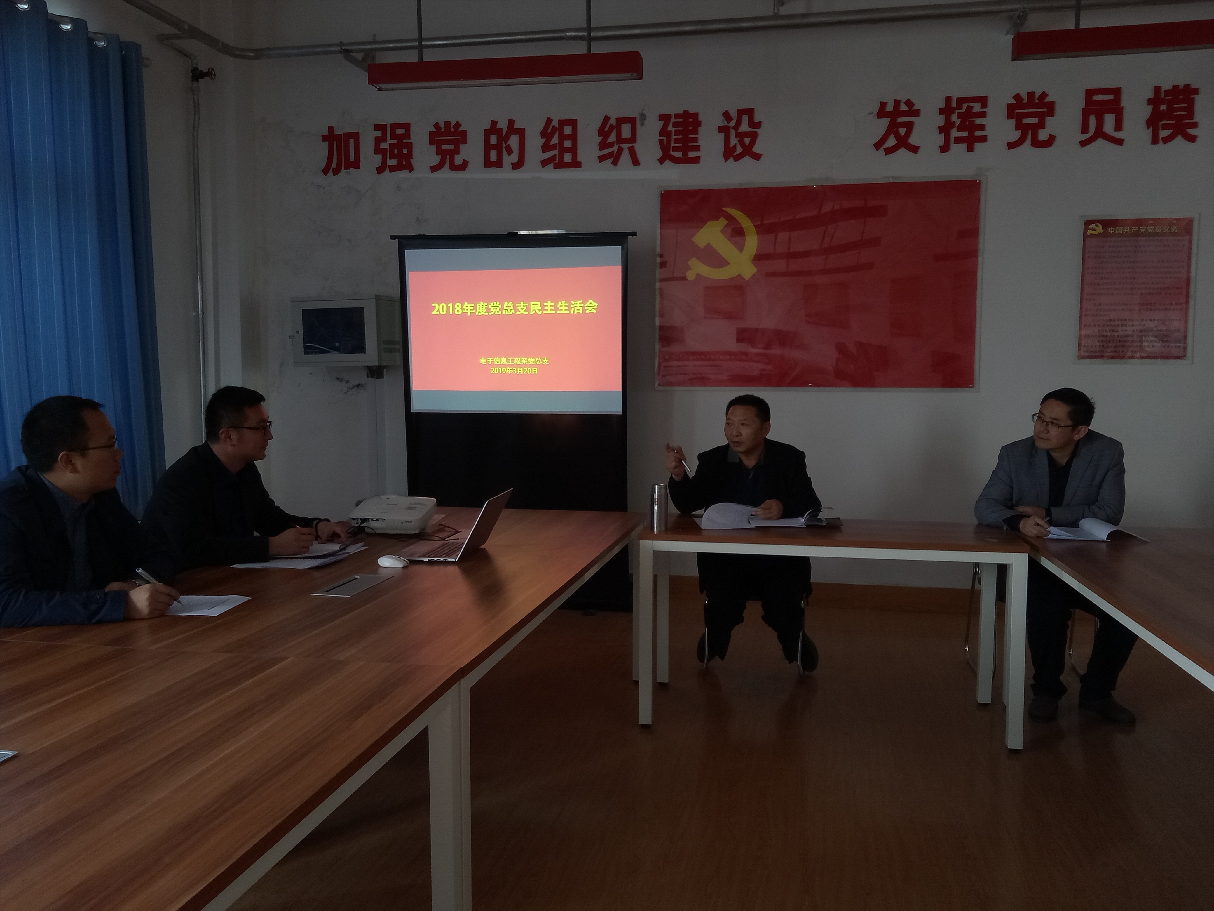 3月20日下午,電子信息工程系黨總支在尚德樓五樓黨員活動室,召開了2018年度班子民主生活會。會議由黨總支書記袁青年同志主持,黨總支班子成員、系主任參加。