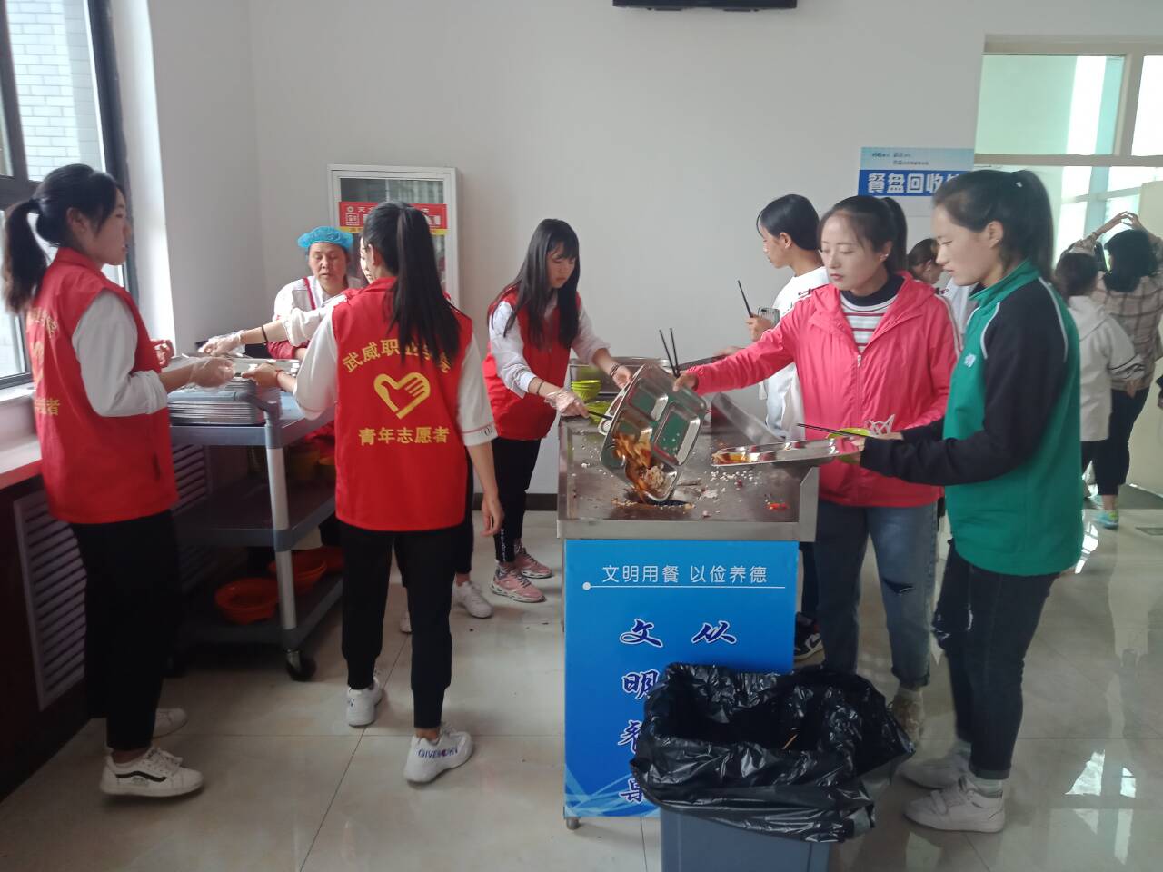 為了規(guī)范學(xué)生用餐禮儀,培養(yǎng)良好的用餐習(xí)慣,人文藝術(shù)教育系志愿者于5月31日在一號食堂和二號食堂分別進(jìn)行了“自覺回收餐盤,文明用餐”的志愿服務(wù)活動,在負(fù)責(zé)人的組織下同學(xué)們禮貌待人,溫馨提示同學(xué)們回收餐盤,于己方便,更是與人方便。