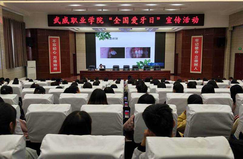 學院婦聯(lián)邀請武威腫瘤醫(yī)院口腔科主任韓冬做題為《青年口腔保健知識》的講座。韓冬結(jié)合多年口腔疾病診療經(jīng)驗,從青年口腔衛(wèi)生、口腔疾病預(yù)防及口腔正畸處理等方面入手,做了精彩講解,借助牙齒道具展示了正確的刷牙方法,并對同學們的各類口腔問題作了解答。講座結(jié)束后,武威腫瘤醫(yī)院和愛牙協(xié)會在大學生活動中心前廣場為同學們開展義診活動,發(fā)放口腔健康宣傳資料600余份。