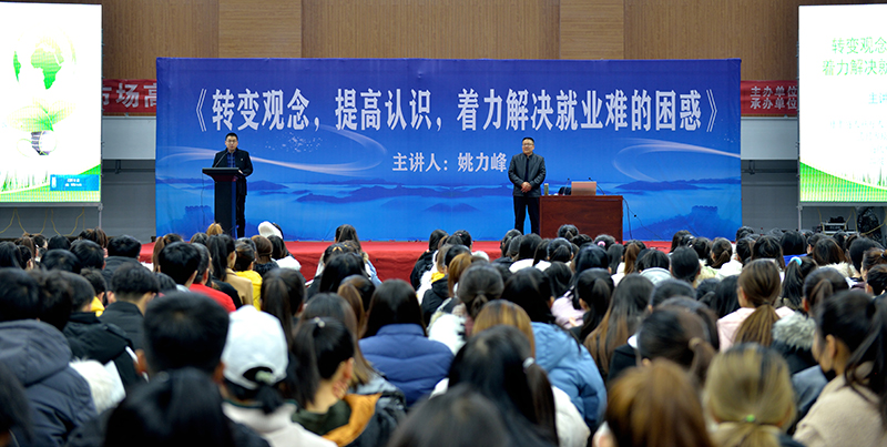 為貫徹2020屆全國普通高校畢業(yè)生就業(yè)創(chuàng)業(yè)工作網(wǎng)絡(luò)視頻會議精神,學院以習近平新時代中國特色社會主義思想為指導,深入落實黨中央、國務(wù)院關(guān)于促進高校畢業(yè)生就業(yè)創(chuàng)業(yè)的一系列重大決策部署,把畢業(yè)生就業(yè)工作擺在最突出位置,確保畢業(yè)生就業(yè)大局穩(wěn)定。12月14日上午,學院組織2020屆畢業(yè)生,在體育館參加了題為《轉(zhuǎn)變觀念,提高認識,著力解決就業(yè)難得困惑》的專家講座,引導畢業(yè)生轉(zhuǎn)變觀念、積極就業(yè)。講座由省人社廳人力資源市場檔案管理部部長姚力峰主講,招生就業(yè)處副處長董鵬主持。