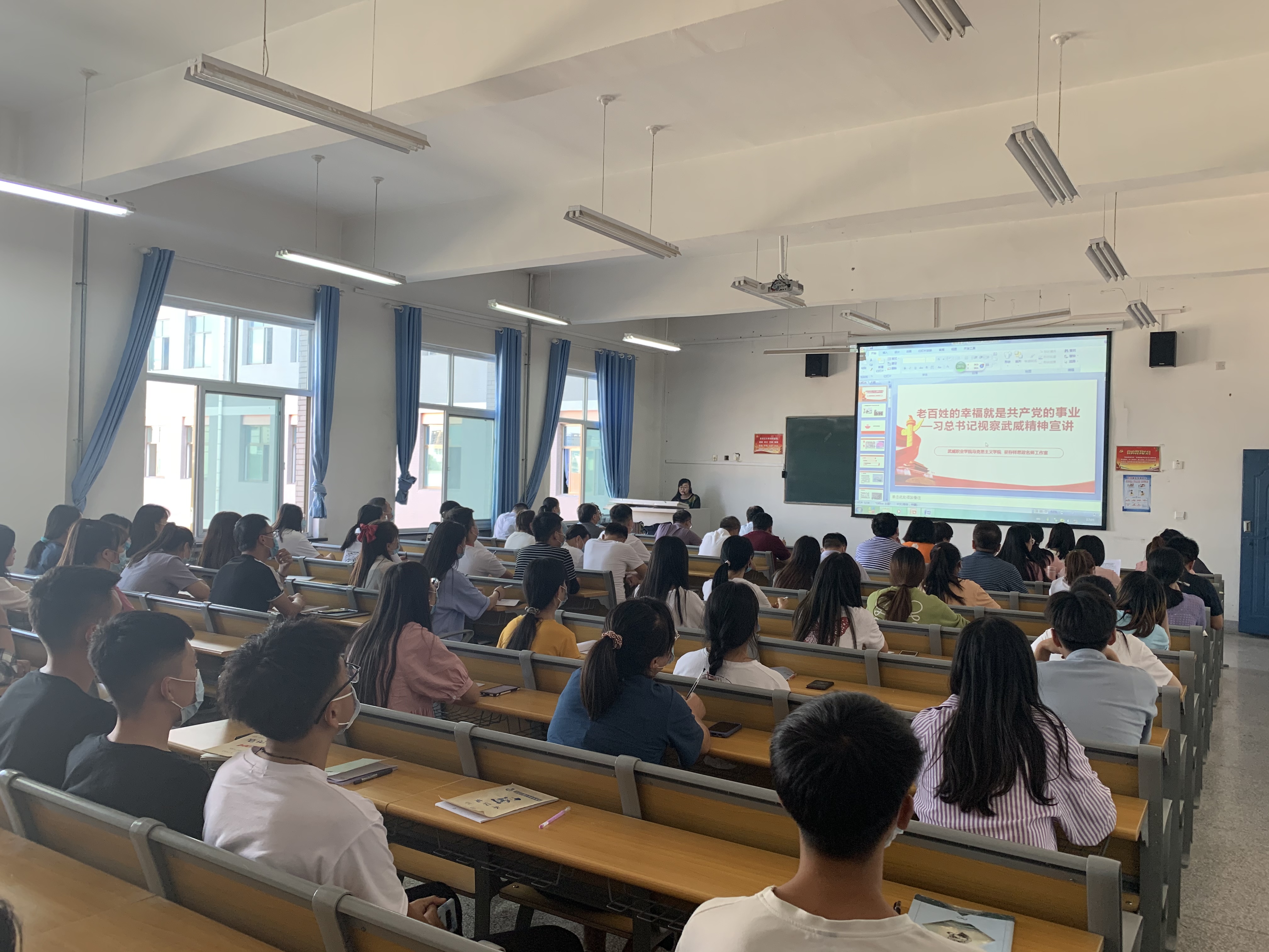 王靜老師圍繞習(xí)近平總書(shū)記視察甘肅,特別是2019年8月21日視察古浪縣黃花灘移民區(qū)富民新村社區(qū)和八步沙林場(chǎng)時(shí)的重要講話和指示精神,向廣大師生展開(kāi)深入宣講,闡釋解讀習(xí)近平總書(shū)指出的“老百姓的幸福就是共產(chǎn)黨的事業(yè)”的本質(zhì)內(nèi)涵,使習(xí)近平總書(shū)記對(duì)武威人民的情感關(guān)懷深入人心。