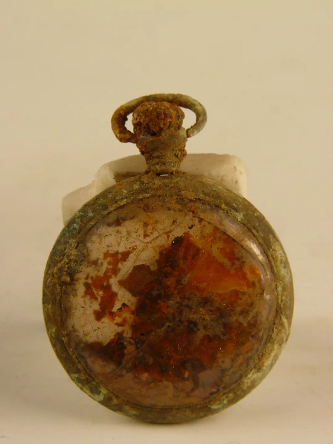 這只懷表于1971年從撫順平頂山慘案遺址出土,表蒙有明顯的裂痕,表盤內(nèi)已經(jīng)沒有指針。雖然銹蝕嚴重,但仍能看到被火燒過的痕跡。這只沒有指針的懷表,凝固了時間,也凝固了侵華日軍的滔天罪行。