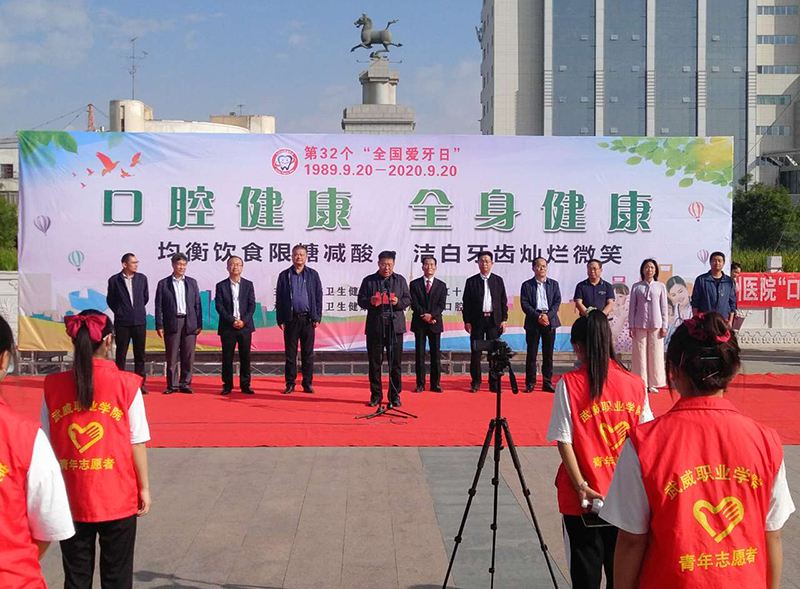 2020年9月20日是第32個(gè)“全國(guó)愛牙日”,為進(jìn)一步普及口腔健康知識(shí),結(jié)合今年全國(guó)愛牙日“口腔健康,全身健康”的主題,9月20日上午,由武威市衛(wèi)生健康委員會(huì)、武威市紅十字協(xié)會(huì)牽頭在文化廣場(chǎng)組織開展了“9.20全國(guó)愛牙日”主題宣傳活動(dòng)。學(xué)院黨委委員、副院長(zhǎng)王守云、醫(yī)學(xué)技術(shù)學(xué)院黨總支書記黃文源及醫(yī)學(xué)技術(shù)學(xué)院100多名口腔醫(yī)學(xué)技術(shù)專業(yè)學(xué)生參加了志愿服務(wù)活動(dòng)。