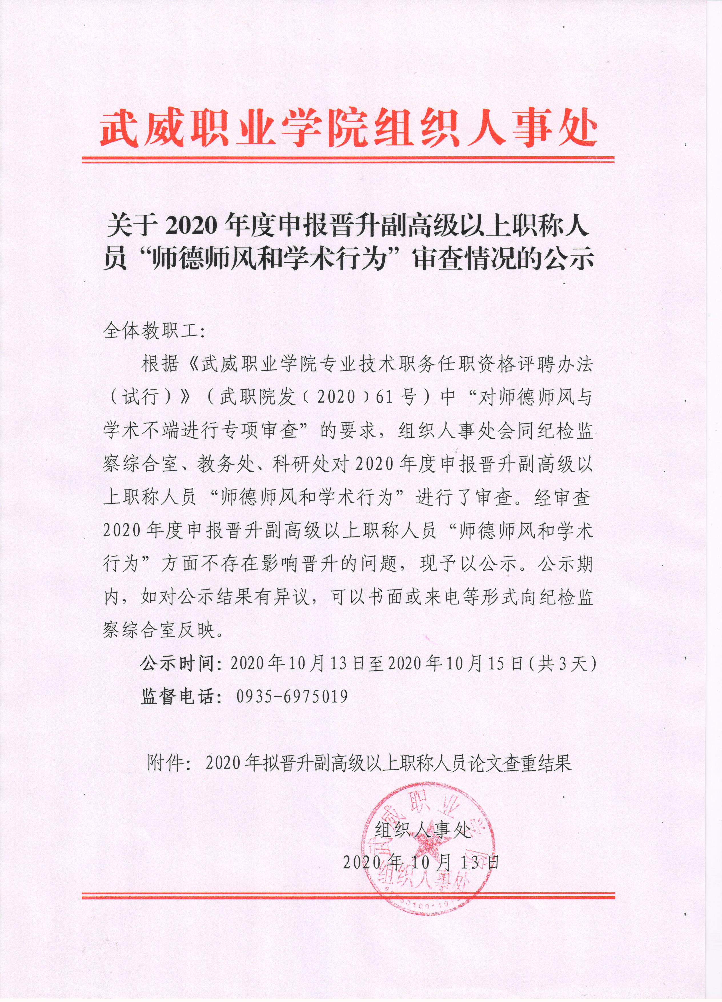 關(guān)于2020年度申報(bào)晉升副高級以上職稱人員“師德師風(fēng)和學(xué)術(shù)行為”審查情況的公示