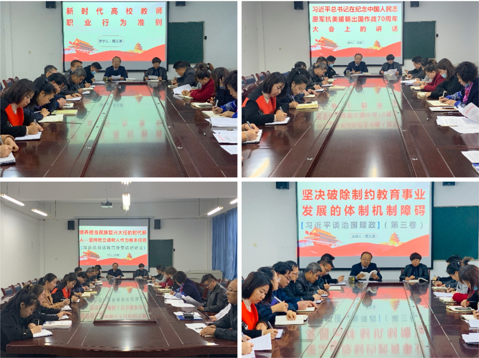黃文源領(lǐng)學(xué)了《習(xí)近平談治國(guó)理政》(第三卷)第十二條 提高保障和改善民生水平——堅(jiān)決破除制約教育事業(yè)發(fā)展的體質(zhì)機(jī)制障礙,解讀了《新時(shí)代高校教師職業(yè)行為十項(xiàng)準(zhǔn)則》,要求所有教師要做以德立身、以德立學(xué)、以德施教、以德育德的楷模。楊如松領(lǐng)學(xué)了《習(xí)近平總書(shū)記教育重要論述講義》第二講 培養(yǎng)擔(dān)當(dāng)民族復(fù)興大任的時(shí)代新人——堅(jiān)持把立德樹(shù)人作為根本任務(wù)。楊建紅老師領(lǐng)學(xué)了習(xí)近平總書(shū)記在紀(jì)念中國(guó) 人民志愿軍抗美援朝出國(guó)作戰(zhàn)70周年大會(huì)的講話。