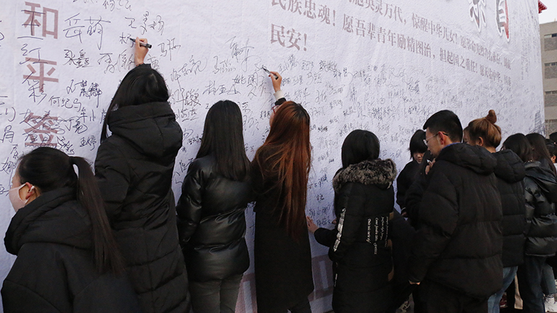 活動最后,參會師生在紀(jì)念背景墻上簽名,共同祈愿: