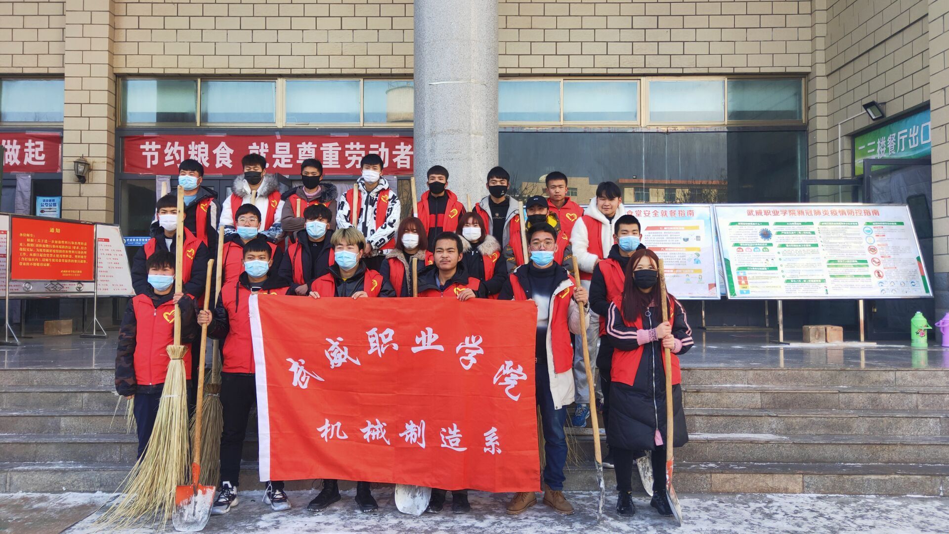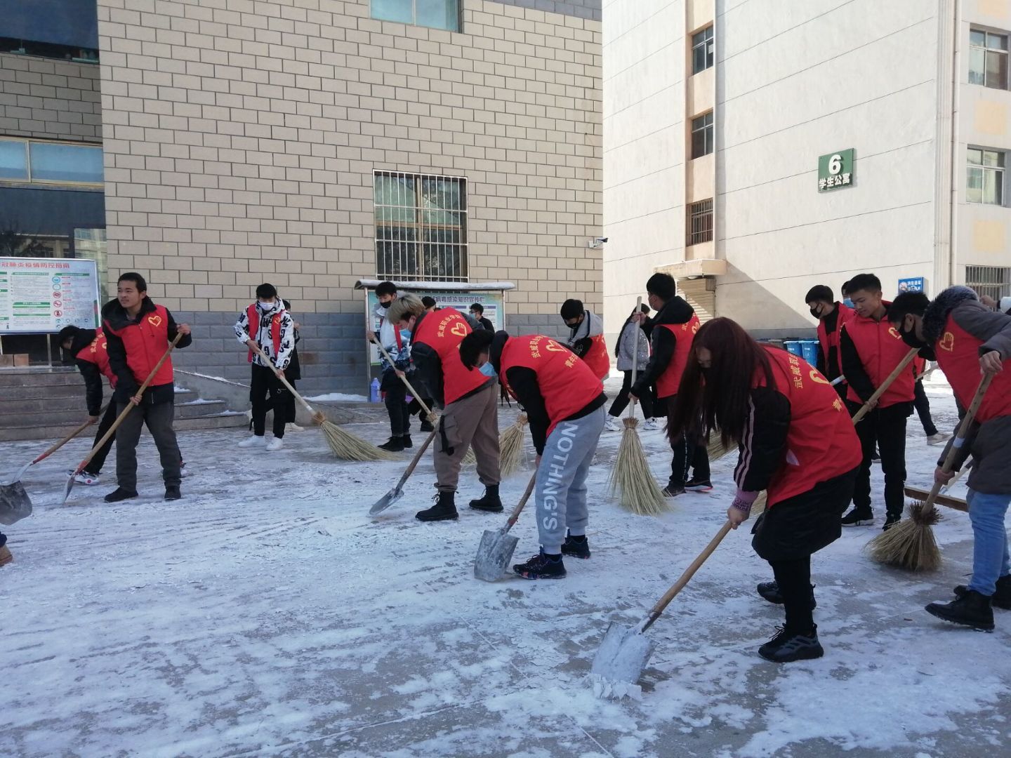 本次鏟雪的區(qū)域是教學樓區(qū)域的主干道和食堂門前道路。寒冷的天氣擋不住大家的勞動熱情,厚厚的冰塊蓋不住大家的志愿精神。鐵鍬聲此起彼伏,大家分工明確,相互合作,現(xiàn)場氣氛熱烈。經(jīng)過多小時的勞動,大家將教學樓前主干道積雪基本清掃干凈。