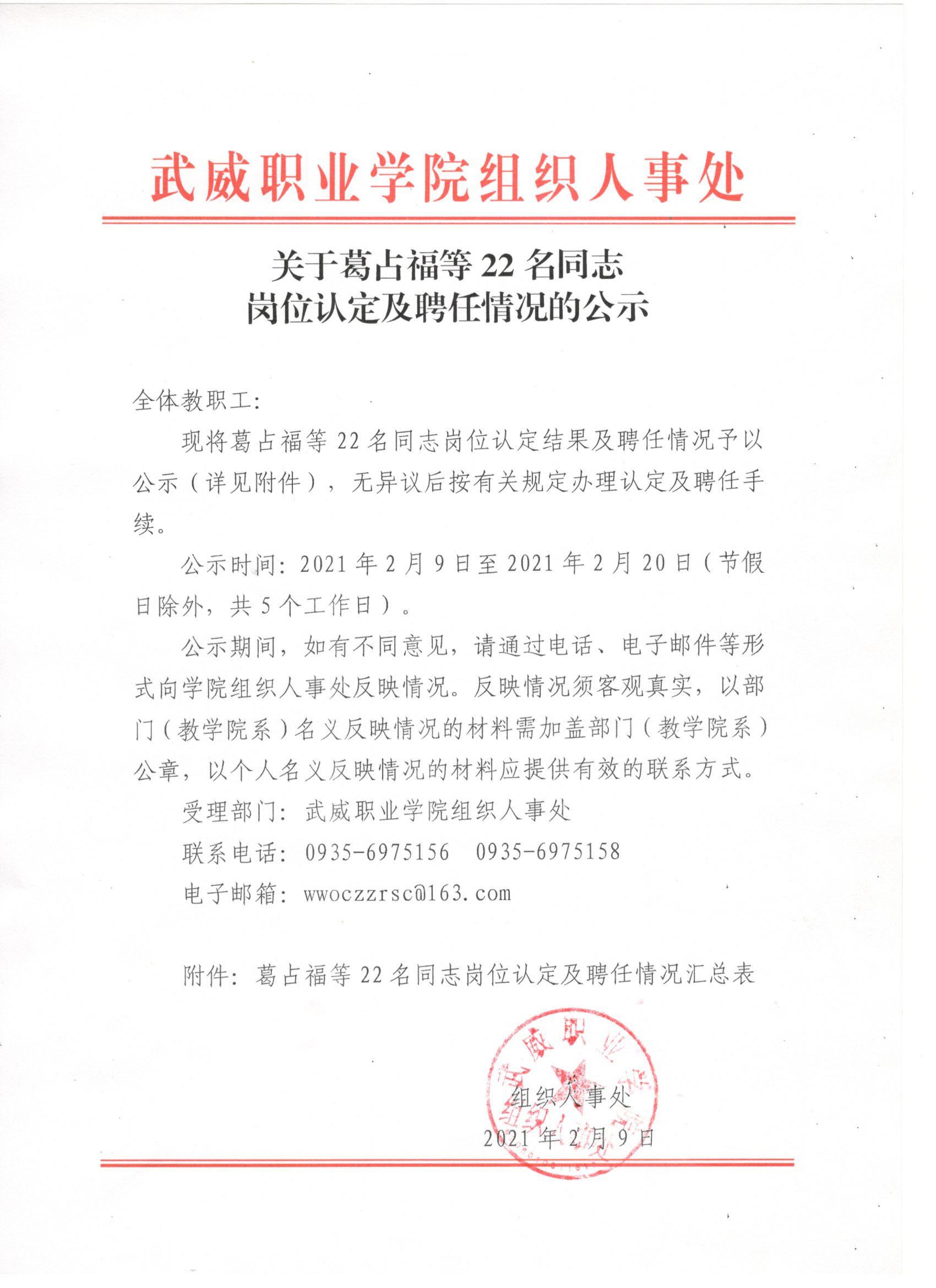 關(guān)于葛占福等22名同志崗位認定及聘任情況的公示
