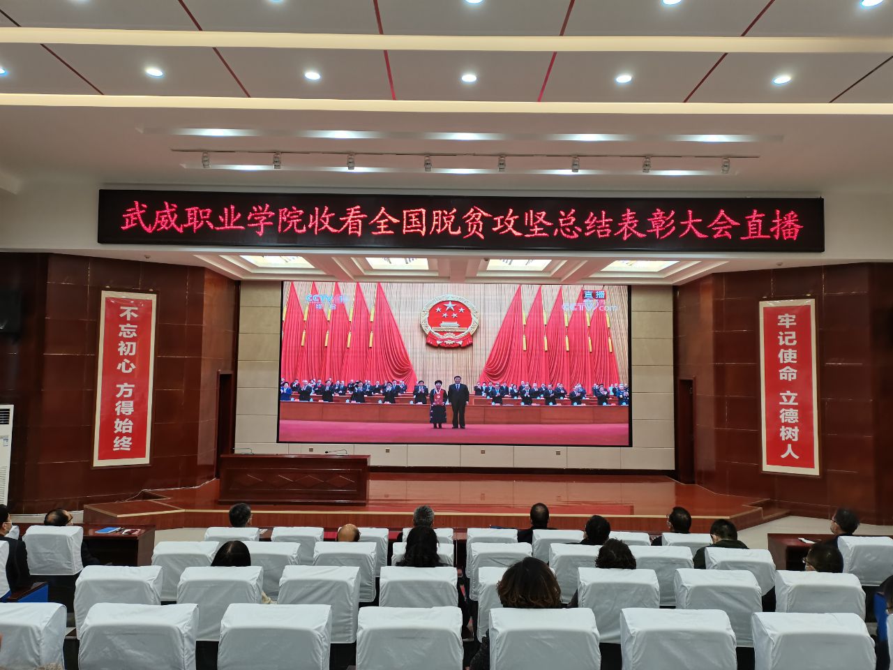 2月25日上午,武威職業(yè)學(xué)院組織干部職工收看全國脫貧攻堅(jiān)總結(jié)表彰大會(huì)。學(xué)院黨委書記、院長趙明,黨委副書記翟存祥,黨委委員、副院長王永緒,黨委委員、紀(jì)委書記、監(jiān)察專員陳曉煜,黨委委員、副院長張開禮和全體幫扶干部、副科級(jí)以上干部在菁英廳集中進(jìn)行了收看,其他教職工通過電腦和手機(jī)直播觀看了大會(huì)盛況。
