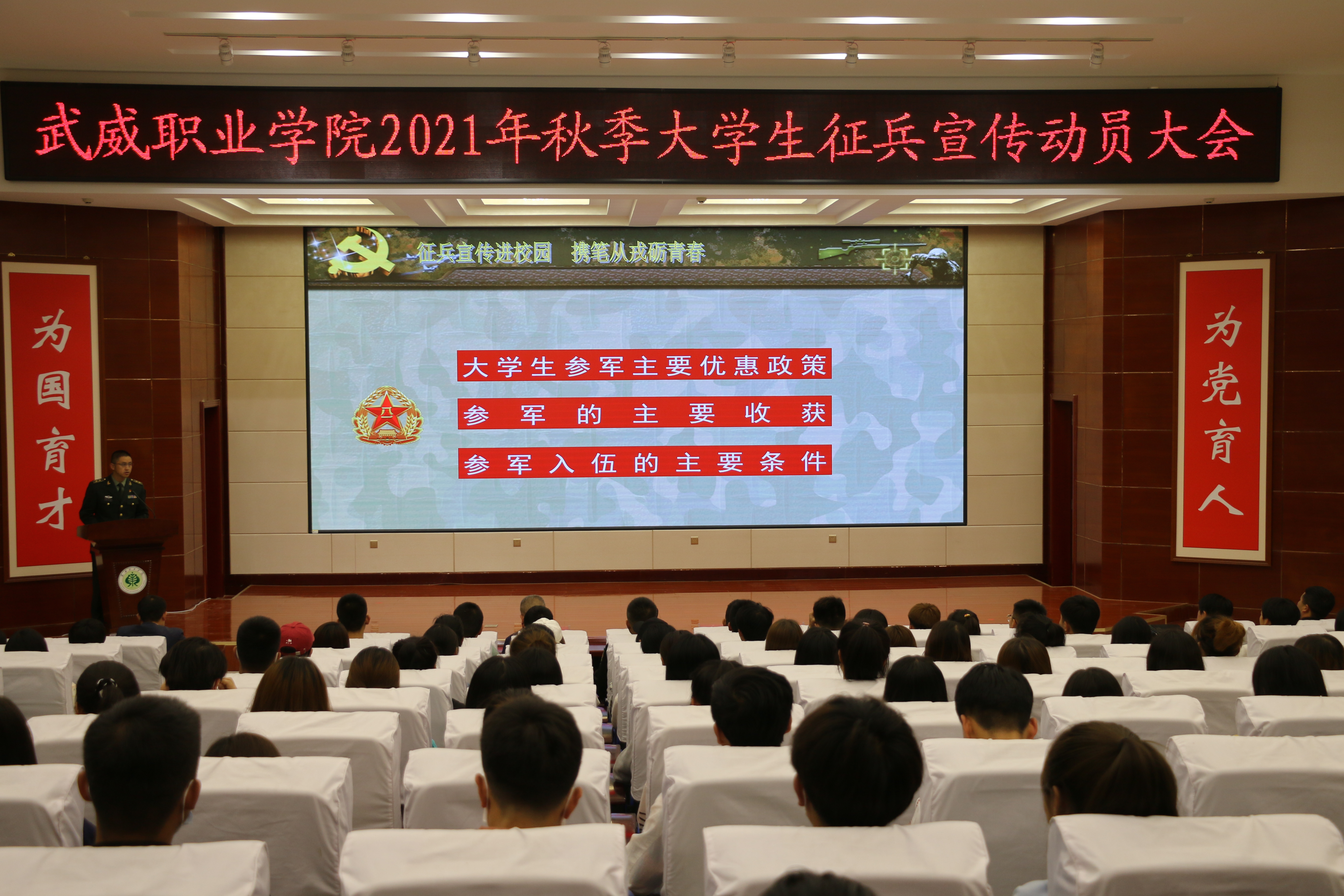 征兵宣傳動員大會上,同學(xué)們觀看了甘肅省和武威市征兵宣傳片,何志強圍繞征兵優(yōu)撫政策和應(yīng)征報名條件、程序進行了宣講,全方位、多角度向同學(xué)們詳細介紹了2021年大學(xué)生征兵的入伍流程、應(yīng)征條件、選用培養(yǎng)、優(yōu)惠政策等。