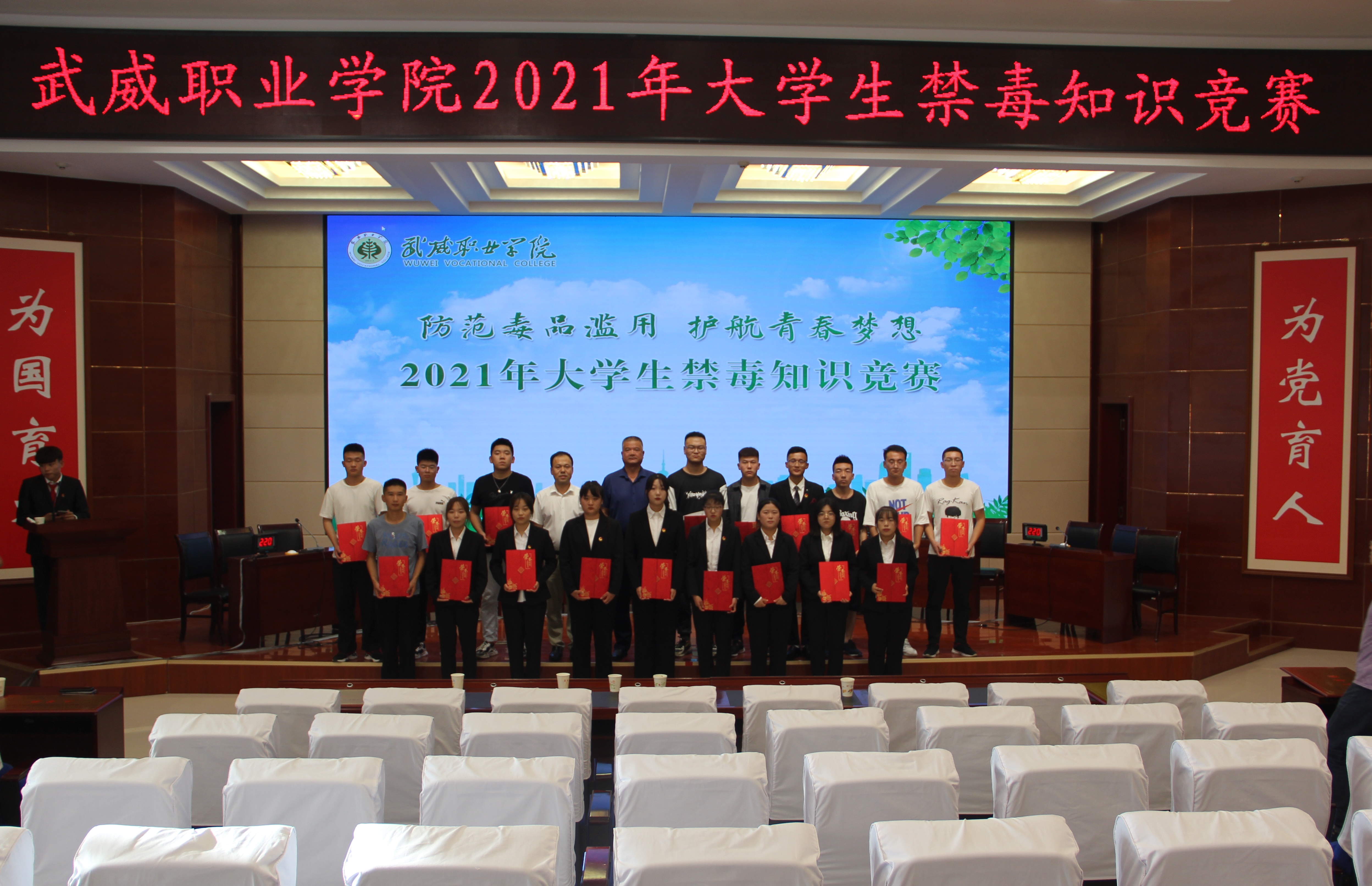 為加強在校大學(xué)生禁毒知識普及教育,深入推進青少年毒品預(yù)防教育“6.27”工程,7月5日下午,學(xué)院在菁英廳舉辦以“防范毒品濫用,護航青春夢想”為主題的2021年大學(xué)生禁毒知識競賽決賽。學(xué)院黨委委員、副院長王守云出席活動。各教學(xué)院系200多名師生觀看了比賽。