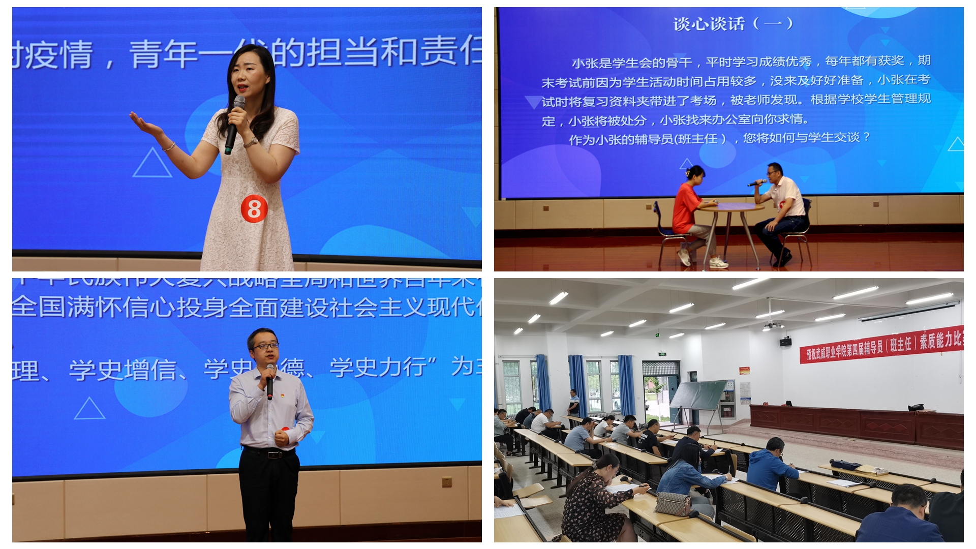 本次比賽由學(xué)生工作處主辦,參照省賽賽制,分為兩個(gè)階段四個(gè)環(huán)節(jié)進(jìn)行。第一階段比賽分為筆試和案例分析兩個(gè)環(huán)節(jié),第二階段比賽分為談心談話和理論宣講兩個(gè)環(huán)節(jié),共有36名輔導(dǎo)員(班主任)參加初賽。