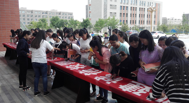 6月14日是第九個(gè)全國(guó)“信用記錄關(guān)愛(ài)日”。為進(jìn)一步加強(qiáng)我院學(xué)生的誠(chéng)信教育,結(jié)合當(dāng)前學(xué)院正在進(jìn)行的社會(huì)信用體系建設(shè)及國(guó)家助學(xué)貸款工作,當(dāng)日中午12時(shí),學(xué)生工作處在大學(xué)生活動(dòng)中心廣場(chǎng)發(fā)起“創(chuàng)建誠(chéng)信校園 樹(shù)立誠(chéng)信學(xué)風(fēng) 做誠(chéng)信學(xué)子”的主題簽名倡議活動(dòng)。200多名學(xué)生頂著炎炎烈日前來(lái)參加簽名活動(dòng),并在橫幅上鄭重簽下了自己的名字。