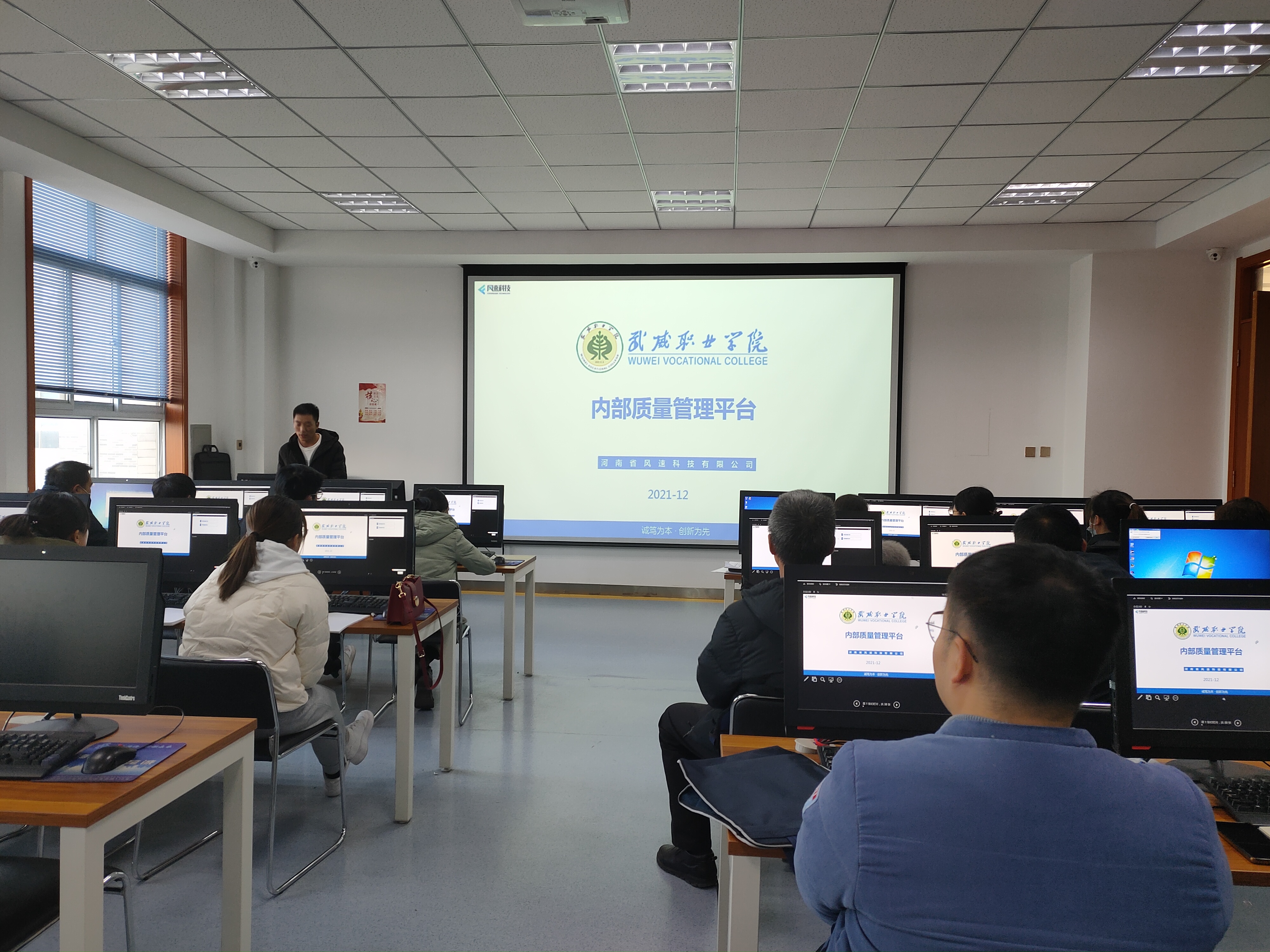 風(fēng)速科技有限公司項(xiàng)目經(jīng)理徐來彬?qū)處熯M(jìn)行了培訓(xùn)。重點(diǎn)介紹了內(nèi)部質(zhì)量管理平臺整體架構(gòu)、主要功能、任務(wù)提取、上傳、轉(zhuǎn)辦,任務(wù)辦理與審核、通報(bào)、文檔庫上傳與使用、績效考核等,并進(jìn)行現(xiàn)場操作演示,就參會教師存在的問題進(jìn)行了溝通交流。