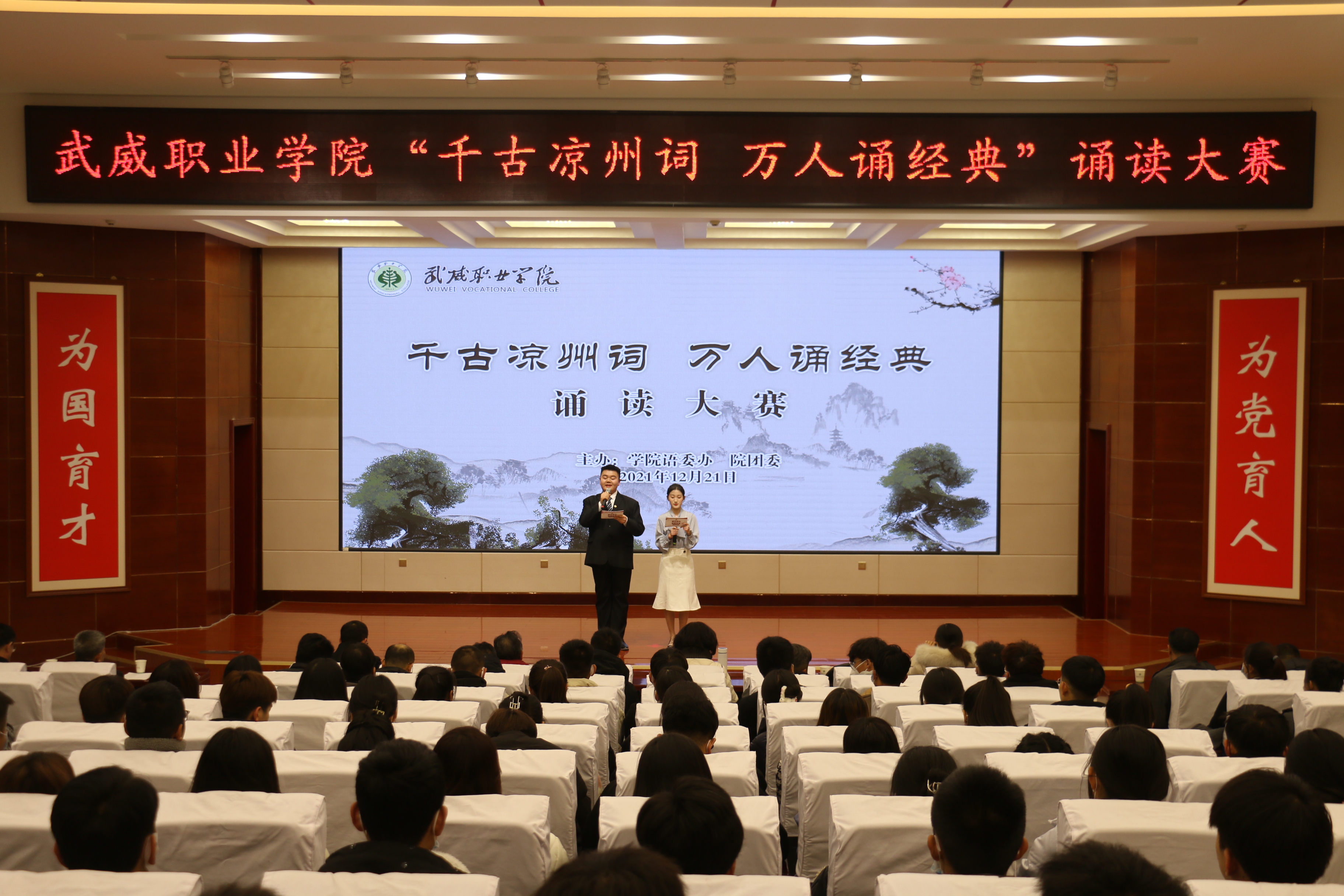 為深化黨史學(xué)習(xí)教育,推進(jìn)“雙高計(jì)劃”建設(shè)任務(wù),弘揚(yáng)涼州文化,傳承絲路精神,助推全國文明城市創(chuàng)建,營造書香校園氛圍,12月21日晚,學(xué)院“千古涼州詞 萬人誦經(jīng)典”誦讀大賽在菁英廳舉辦,學(xué)院黨委書記、院長趙明,黨委委員、副院長張開禮,黨委委員、副院長王守云出席活動(dòng),各分團(tuán)委書記及學(xué)生代表250余人觀看比賽。