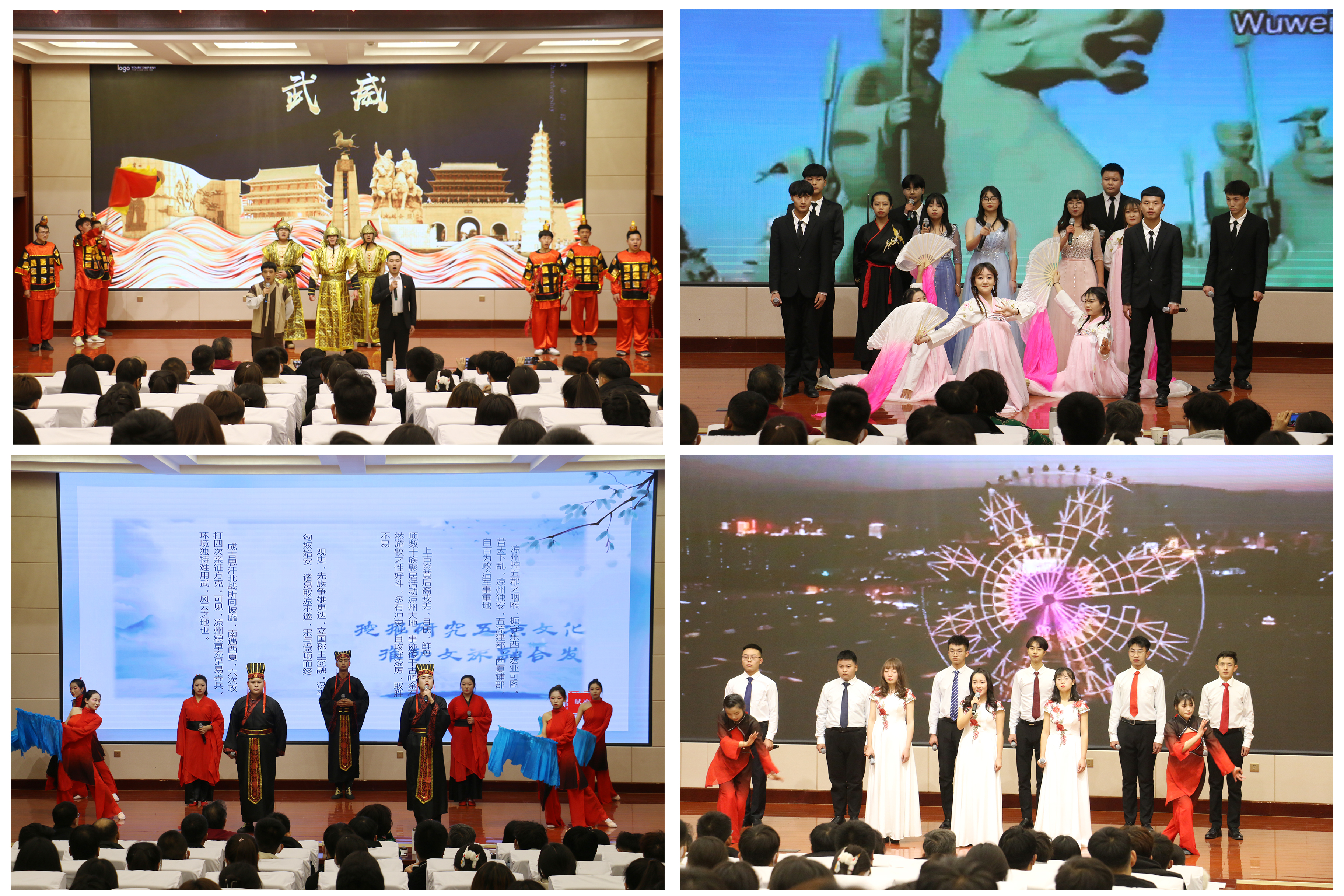 比賽現(xiàn)場精彩紛呈,高潮迭起,來自11個(gè)教學(xué)院系推選的節(jié)目匯聚菁英廳,以配樂吟誦、伴舞、書法、武術(shù)、情景劇表演等形式,上演“車馬相交錯(cuò),歌吹日縱橫”的涼州遺韻。一首首字正腔圓的吟誦、一場場聲情并茂的演繹,全方位展示了涼州文化深厚的底蘊(yùn)和鮮明的地域特色。