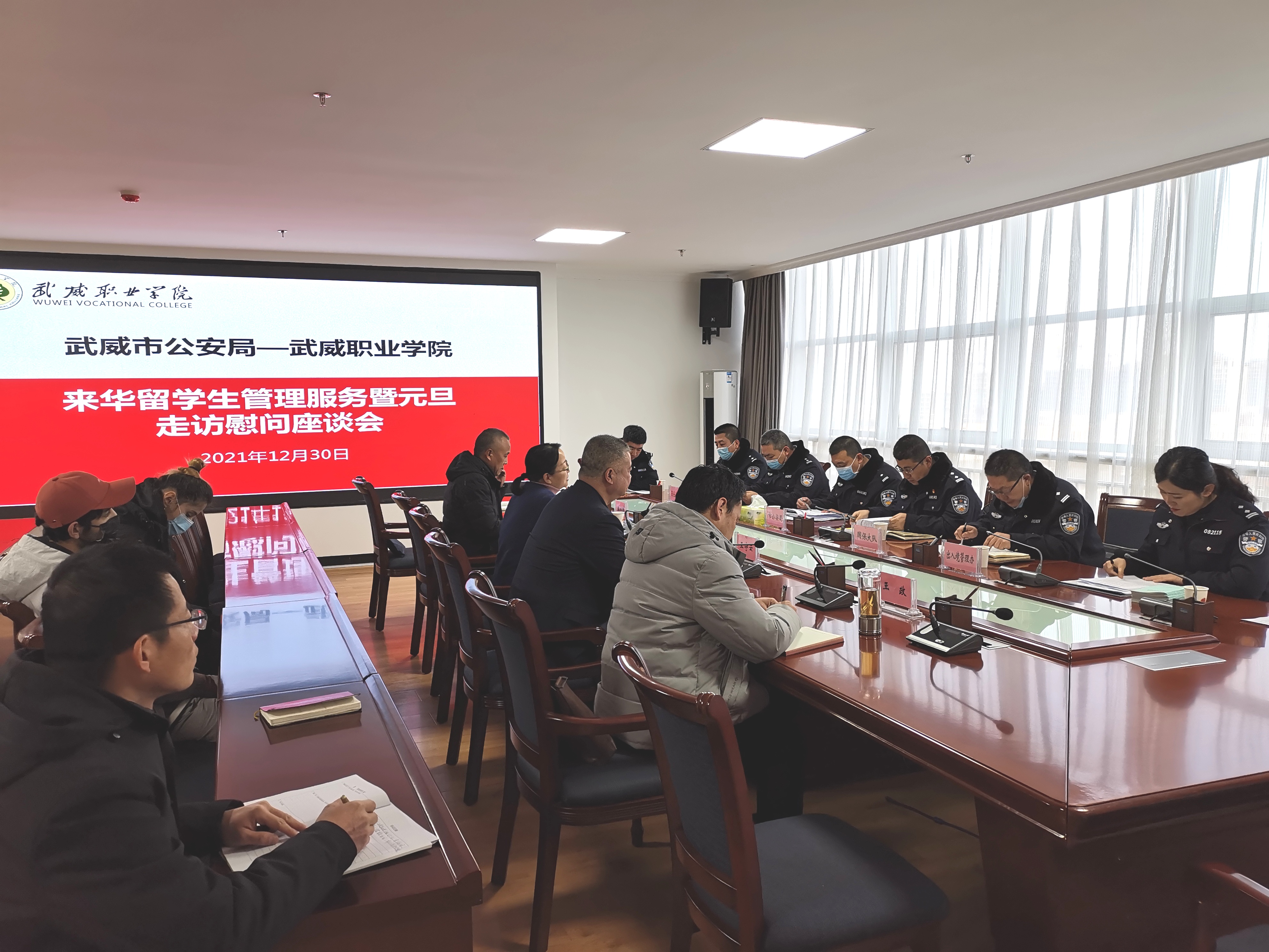 12月30日上午,市公安局出入境管理科、非政府組織管理辦公室,市公安局涼州分局國(guó)安大隊(duì)、反恐大隊(duì)、出入境管理辦公室、涼州分局西關(guān)街派出所一行十一人到訪學(xué)院,開展來華留學(xué)生管理服務(wù)暨元旦走訪慰問活動(dòng)。黨委委員、副院長(zhǎng)田迎春、王守云出席活動(dòng)。國(guó)際合作與交流處處長(zhǎng)潘從民、保衛(wèi)處處長(zhǎng)王政及相關(guān)人員,2019級(jí)、2021級(jí)在華留學(xué)生參加活動(dòng)。田迎春主持活動(dòng)。