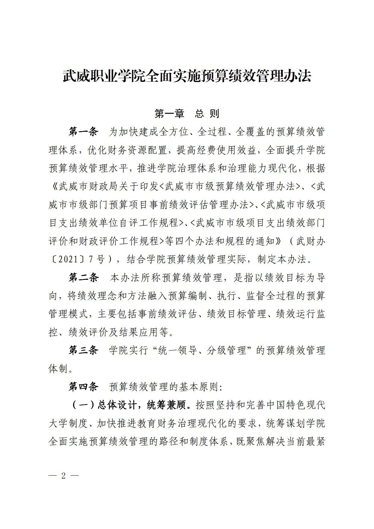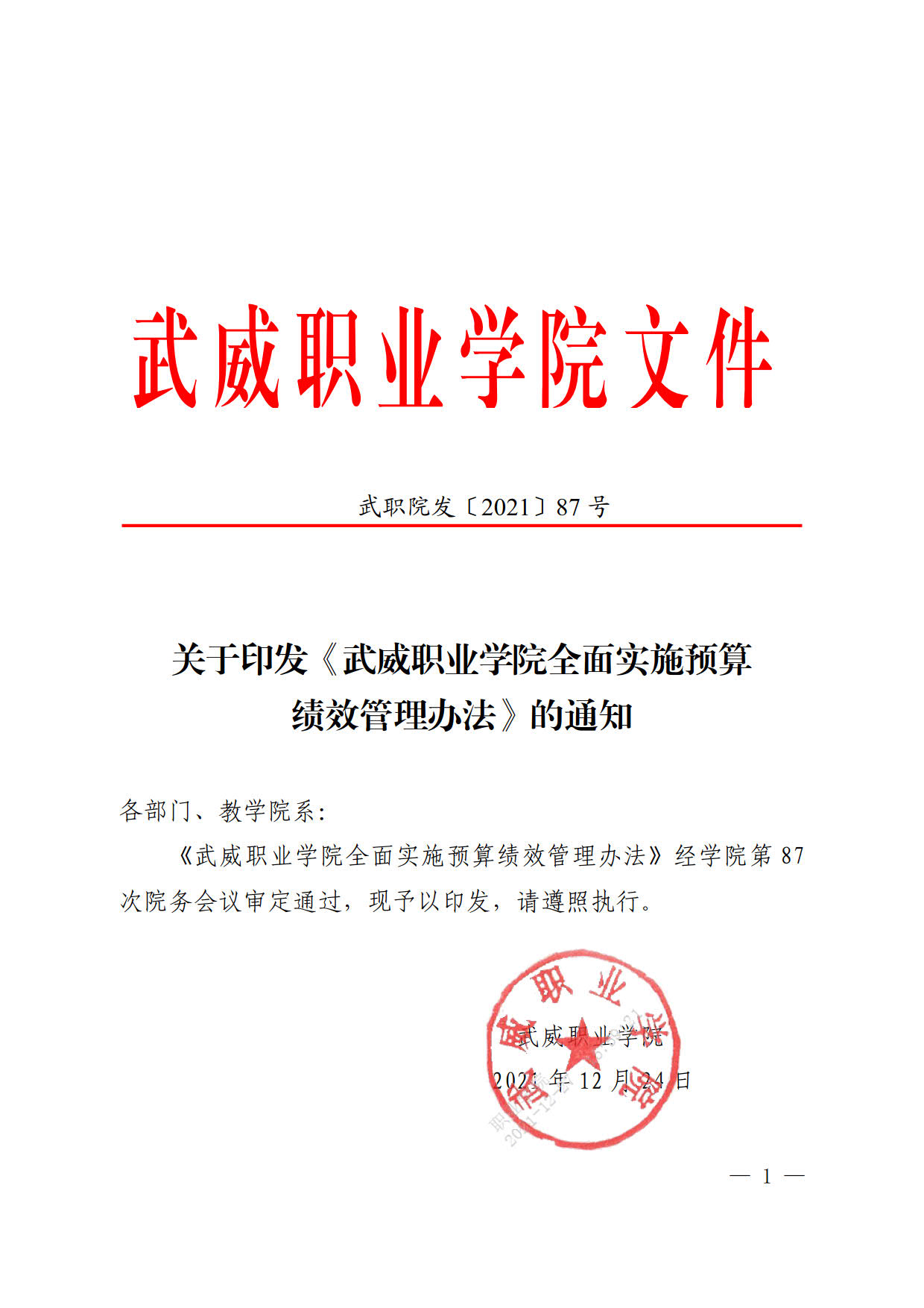 關(guān)于印發(fā)《武威職業(yè)學(xué)院全面實(shí)施預(yù)算績(jī)效管理辦法》的通知