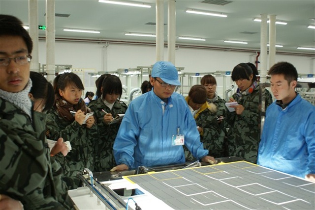 在校外實(shí)訓(xùn)過程中,由工藝部楊經(jīng)理和工藝部文工程師給大家介紹公司情況、公司管理規(guī)范,并帶領(lǐng)大家進(jìn)行參觀,給學(xué)生詳細(xì)講解整個光伏產(chǎn)業(yè)鏈,包括硅片的生產(chǎn)、電池片的生產(chǎn)和太陽能電池組件的生產(chǎn),重點(diǎn)是光伏組件的生產(chǎn)。實(shí)訓(xùn)期間由工廠師傅帶領(lǐng)學(xué)生在車間分組進(jìn)行實(shí)訓(xùn)。依據(jù)光伏組件生產(chǎn)工作流程實(shí)訓(xùn)內(nèi)容分為前道工序和后道工序,前道工序包括:電池片篩選、單焊、串焊、疊層、初檢、EL1測試和層壓;后道工序包括:削邊、裝邊框、裝接線盒、清洗、EL2測試、功率測試、終檢和包裝入庫。同學(xué)們通過親身體驗(yàn)和輪崗學(xué)習(xí),熟悉了光伏組件的每一道生產(chǎn)工序,對光伏組件的整個生產(chǎn)過程有了一個更加清晰的認(rèn)識和了解。