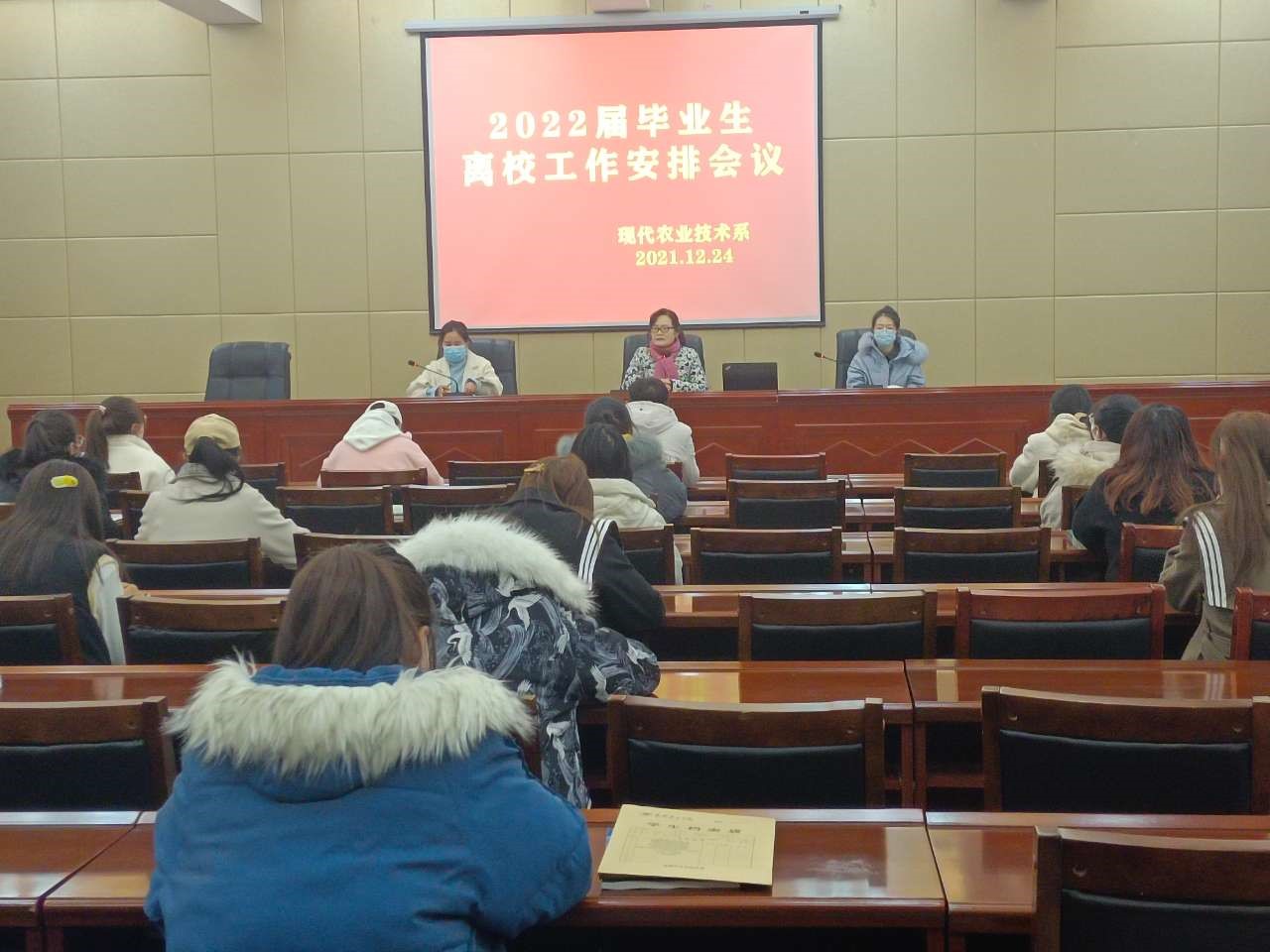 為確保2022屆畢業(yè)生離校工作安全穩(wěn)定、平安有序地進行,12月24日上午,現(xiàn)代農(nóng)業(yè)技術系黨總支書記晏素珍在行樹樓北側報告廳組織召開2022屆畢業(yè)生離校工作安排會議,畢業(yè)班班主任和全體畢業(yè)生參加了會議。