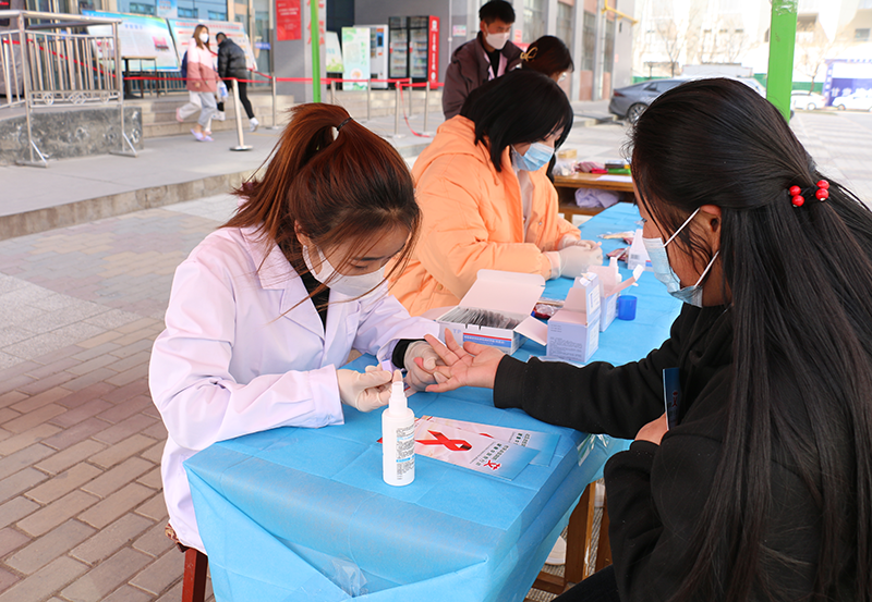 12月1日,學(xué)院護(hù)理系紅絲帶協(xié)會(huì)聯(lián)合涼州區(qū)衛(wèi)生健康局、涼州區(qū)疾控中心,在二號(hào)食堂門口及荷花池開(kāi)展了“世界艾滋病日”青年學(xué)生咨詢檢測(cè)活動(dòng),活動(dòng)中對(duì)260余名學(xué)生進(jìn)行了免費(fèi)艾滋病檢測(cè),并予以獎(jiǎng)品鼓勵(lì),組織了防艾知識(shí)宣傳志愿隊(duì)伍現(xiàn)場(chǎng)發(fā)放宣傳手冊(cè),制作并贈(zèng)送紅絲帶標(biāo)志400余個(gè)。