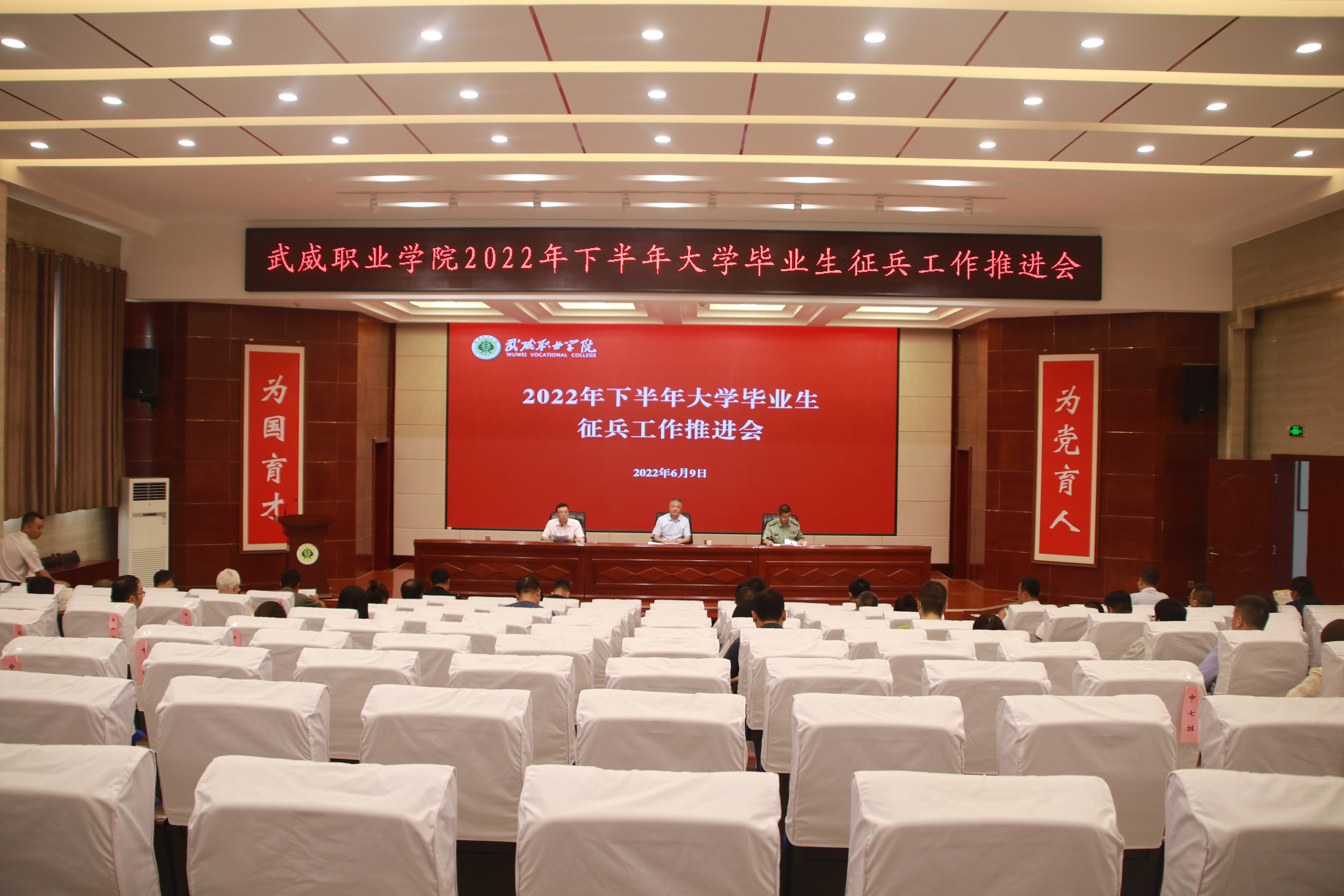 6月9日下午,學(xué)校2022年下半年大學(xué)畢業(yè)生征兵工作推進(jìn)會在菁英廳召開,學(xué)校黨委委員、副校長王守云,涼州區(qū)人武部中校副部長何志強出席會議。
