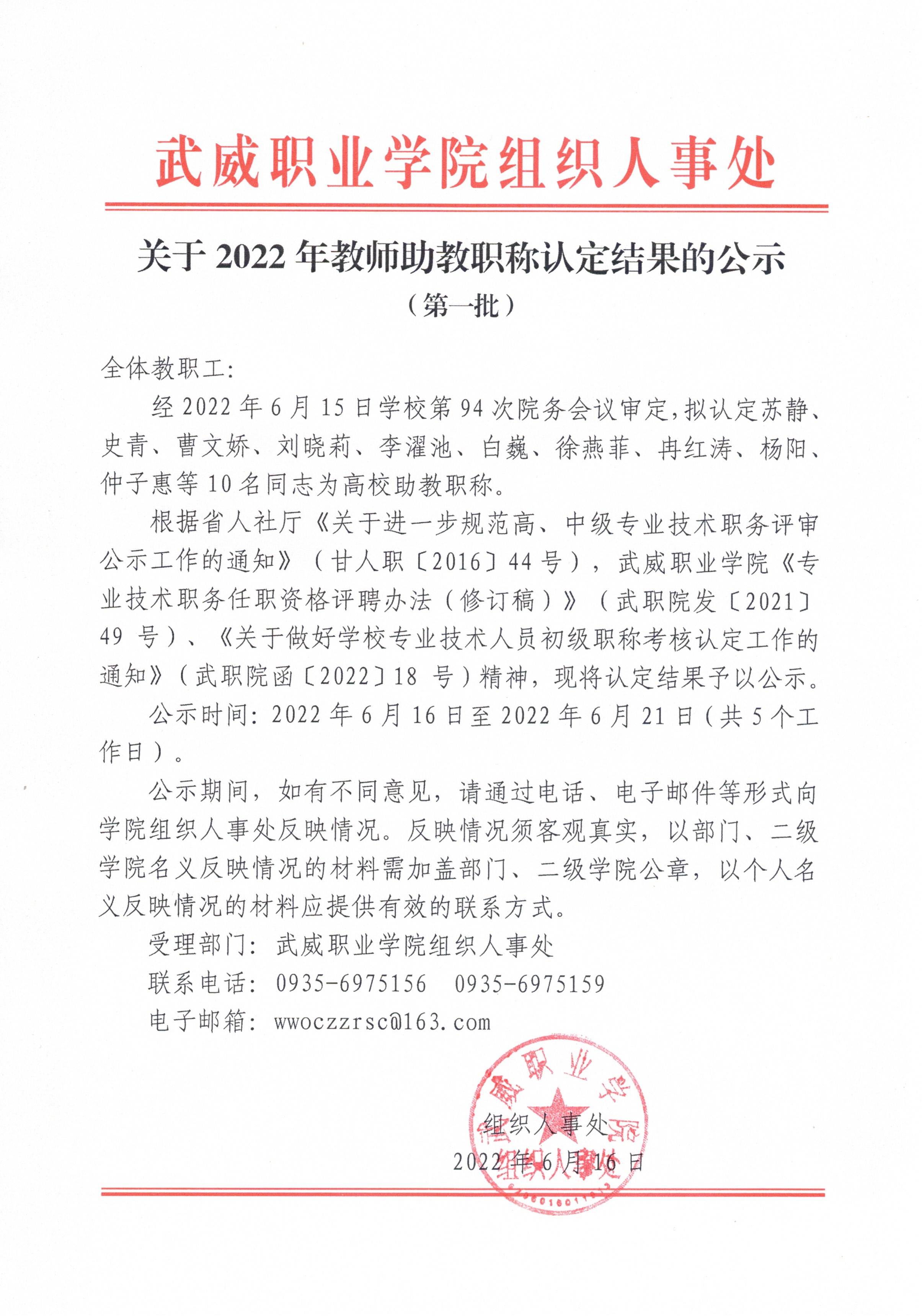 關于2022年教師助教職稱認定結果的公示(第一批)