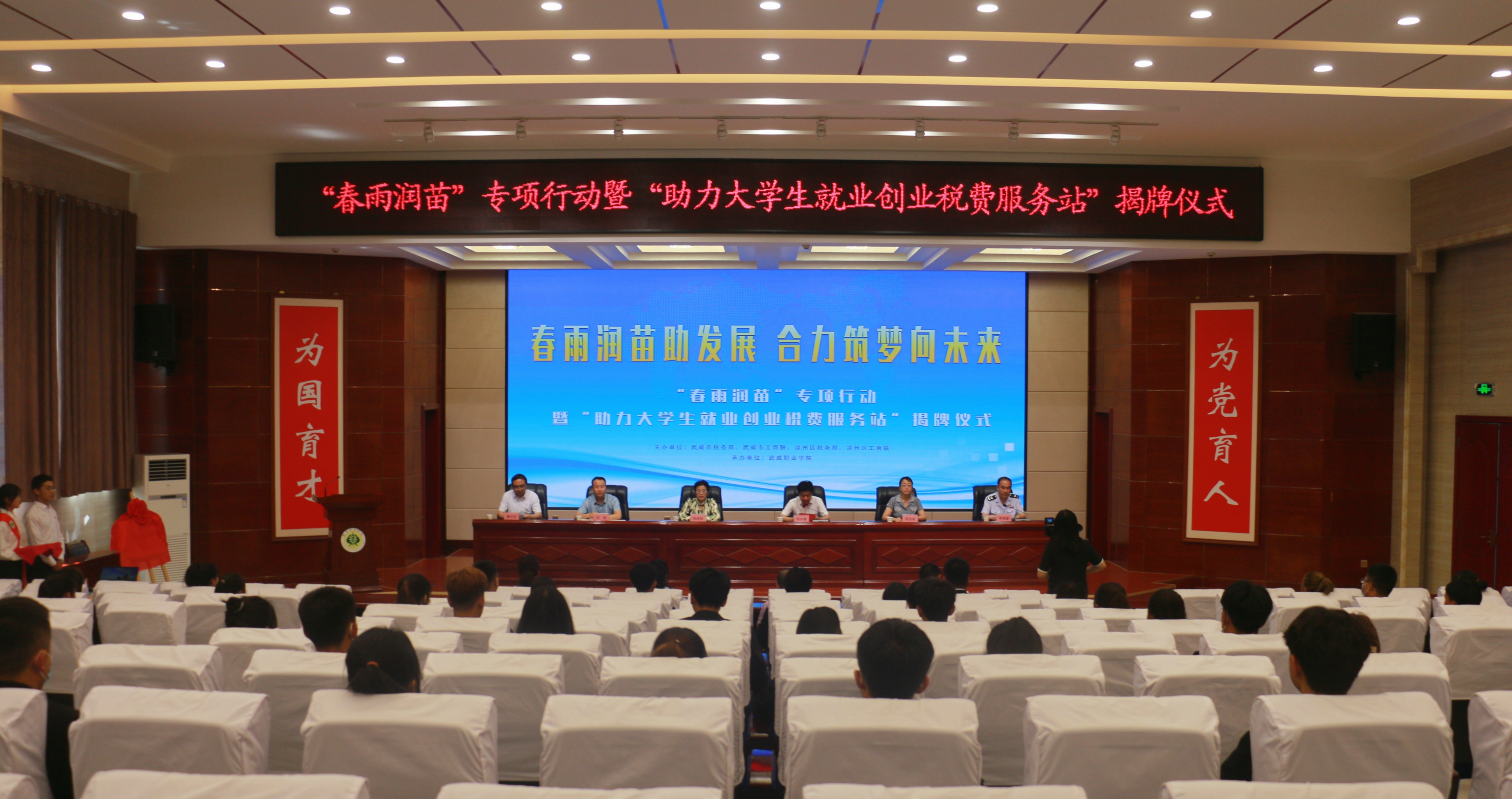 6月10日下午,武威市稅務局聯(lián)合工商聯(lián)在學校菁英廳舉辦“春雨潤苗”專項行動暨“助力大學生就業(yè)創(chuàng)業(yè)稅費服務站”揭牌儀式。武威市稅務局黨委委員、副局長劉永德,武威市工商聯(lián)副主席張連科,涼州區(qū)工商聯(lián)副主席唐紅生,學校黨委委員、副校長田迎春出席揭牌儀式,涼州區(qū)稅務局黨委委員、副局長李斌盛主持活動。武威市稅務局黨委委員、副局長劉永德在講話中指出“助力大學生就業(yè)創(chuàng)業(yè)稅費服務站”的成立,既是武威稅務部門優(yōu)化稅費服務的有力舉措,也是學院、工商聯(lián)和稅務的一次深入合作,更是三方匯聚合力,助力穩(wěn)就業(yè)、保民生、促發(fā)展的積極作為?!?/p>