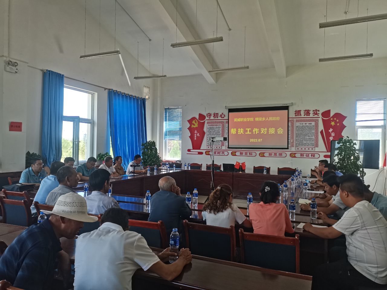 學(xué)校領(lǐng)導(dǎo)、橫梁鄉(xiāng)鄉(xiāng)長張熹中、黨委副書記王劍及幸福新村、康寧新村干部、村民代表召開推進鄉(xiāng)村振興工作座談會。張熹中、王劍代表橫梁鄉(xiāng)對學(xué)校及駐村工作隊在鄉(xiāng)村振興中的幫扶工作表示感謝,特別是結(jié)合鄉(xiāng)村學(xué)校、文化需求,為橫梁鄉(xiāng)完成游園文化墻彩繪,在綠洲小學(xué)、古浪四中成立音樂、武術(shù)社團,為推進鄉(xiāng)村振興發(fā)揮了重要作用。