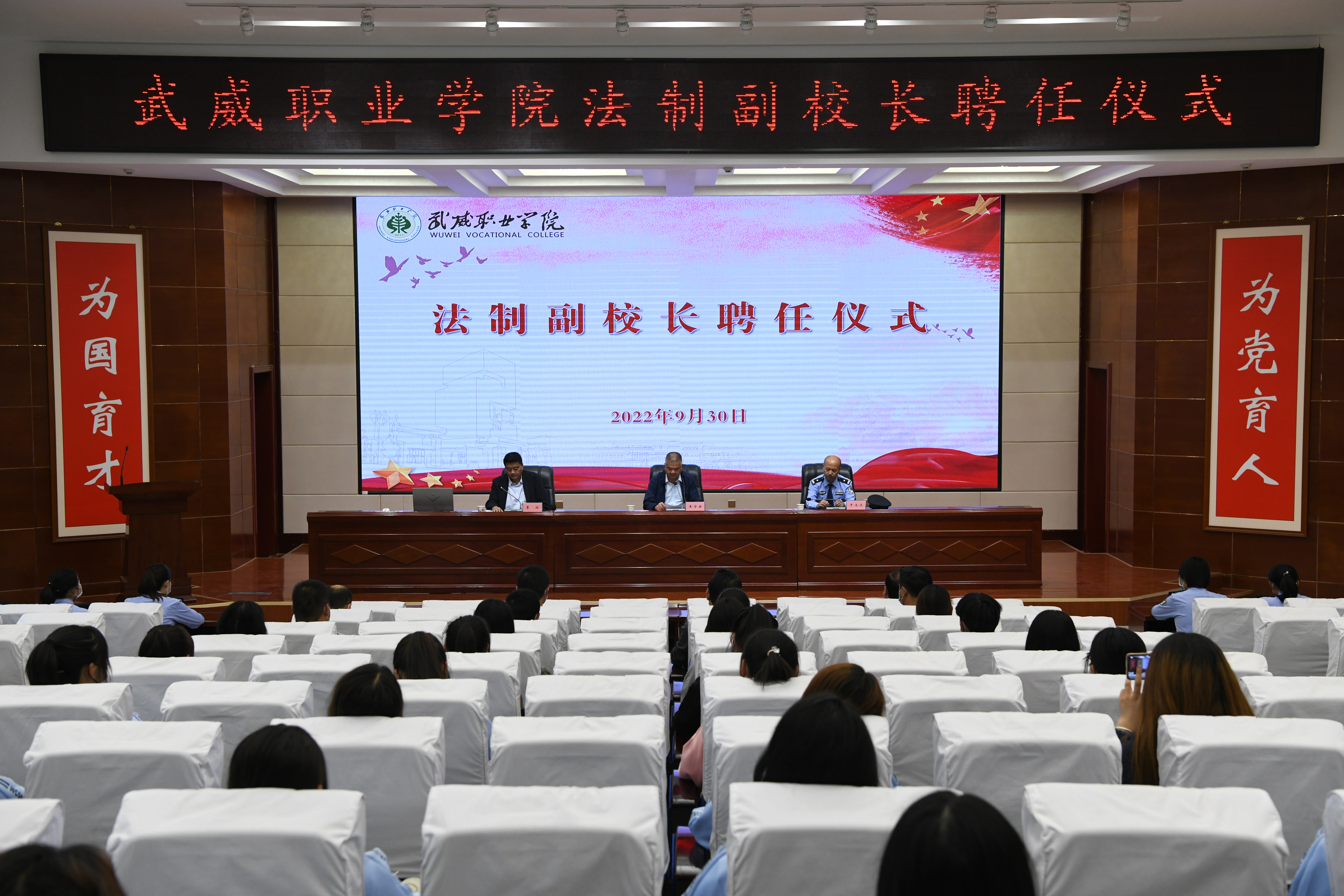 9月30日下午,學(xué)校在學(xué)生發(fā)展中心菁英廳舉行法制副校長聘任儀式,武威市涼州區(qū)公安局西關(guān)派出所所長于文達(dá)、西關(guān)派出所民警代表,學(xué)校相關(guān)部門、各二級學(xué)院負(fù)責(zé)人及師生代表參加了聘任儀式,學(xué)校黨委委員、副校長王守云出席了儀式,儀式由學(xué)校安全保衛(wèi)處負(fù)責(zé)人李欣主持。