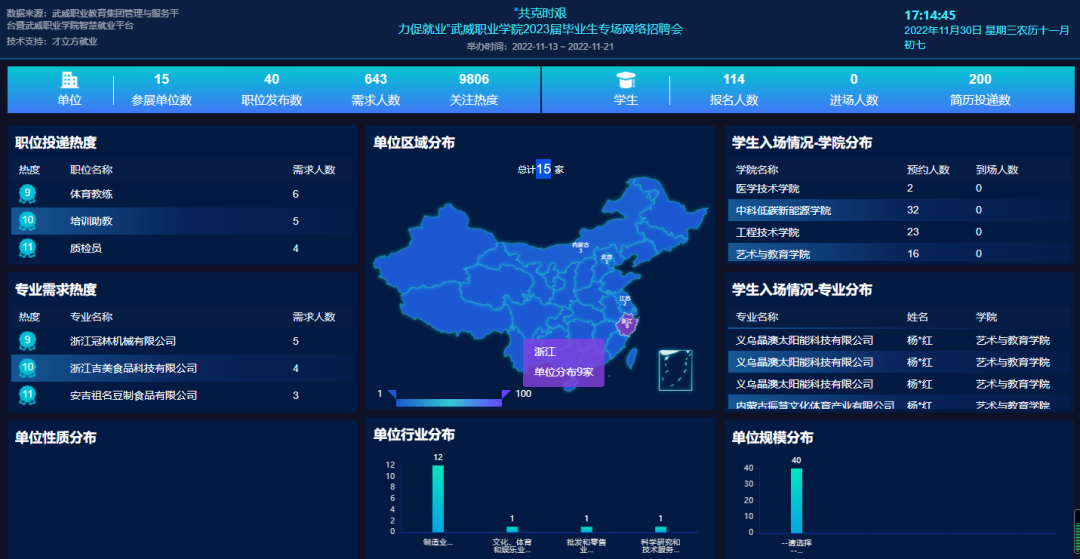 本次云聘系列活動分兩個階段舉行,第一階段為“共克時艱力促就業(yè)”武威職業(yè)學(xué)院2023屆畢業(yè)生專場網(wǎng)絡(luò)招聘會,于11月7日至11月21日舉行。本次招聘會主要面向在疫情條件下,能夠?qū)\嚱舆\(yùn)學(xué)生赴企業(yè)就業(yè)的單位。湖州市安吉縣人力資源和社會保障局組織10余家當(dāng)?shù)仄髽I(yè)參加了本次招聘會,同時吸引內(nèi)蒙古靈圣作物科技有限公司、江蘇京東信息技術(shù)有限公司、義烏晶澳太陽能科技有限公司、內(nèi)蒙古振慧文化體育產(chǎn)業(yè)有限公司等企業(yè)參加,提供招聘職位40個,需求人數(shù)643人,招聘會關(guān)注人次達(dá)9806,200余人投遞簡歷。