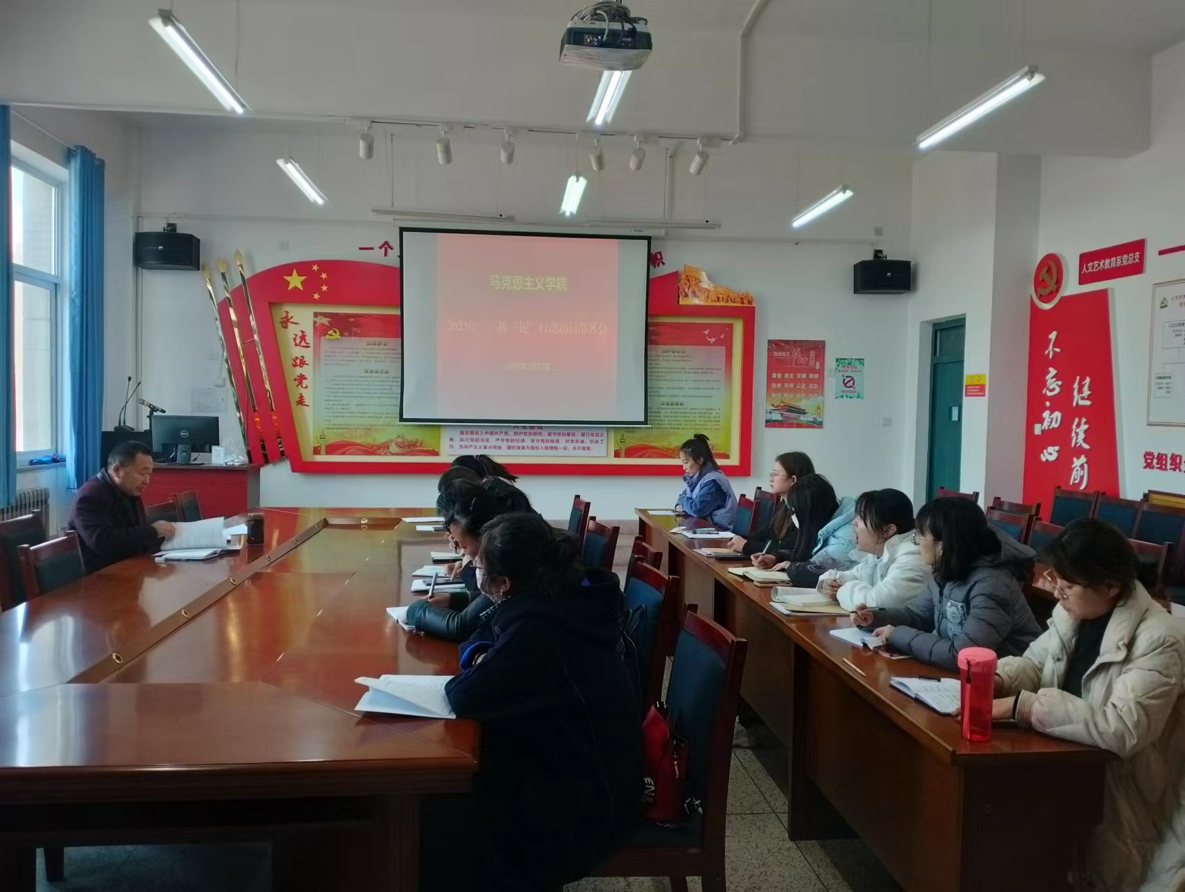 近日,按照學(xué)?!叭ト佟毙袆觿訂T部署會要求,馬克思主義學(xué)院第一時間召開會議,統(tǒng)一思想,明確任務(wù),召開“三抓三促”行動動員部署會,學(xué)院負責(zé)人劉心主持會議,全體思政課教師參加了會議。