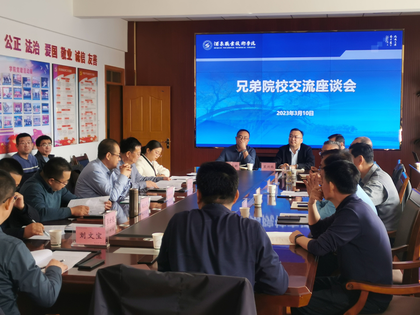 在行知樓會(huì)議室召開交流座談會(huì)。座談會(huì)上,許軍詳細(xì)介紹了酒泉職業(yè)技術(shù)學(xué)院發(fā)展的辦學(xué)特色、專業(yè)建設(shè)、“雙高計(jì)劃”項(xiàng)目建設(shè)和申辦本科層次職業(yè)技術(shù)大學(xué)等情況。翟存祥介紹了武威職業(yè)學(xué)院“雙高計(jì)劃”項(xiàng)目建設(shè)和申辦職業(yè)技術(shù)大學(xué)進(jìn)展。雙方就“雙高計(jì)劃”項(xiàng)目建設(shè)中遇到的堵點(diǎn)、痛點(diǎn)、難點(diǎn)問題和本科層次職業(yè)學(xué)校申辦、高水平專業(yè)群打造、“三教”改革、科研平臺(tái)搭建、社會(huì)服務(wù)能力提升、產(chǎn)業(yè)學(xué)院體制與管理、國(guó)際合作交流等工作進(jìn)行了深入探討交流。
