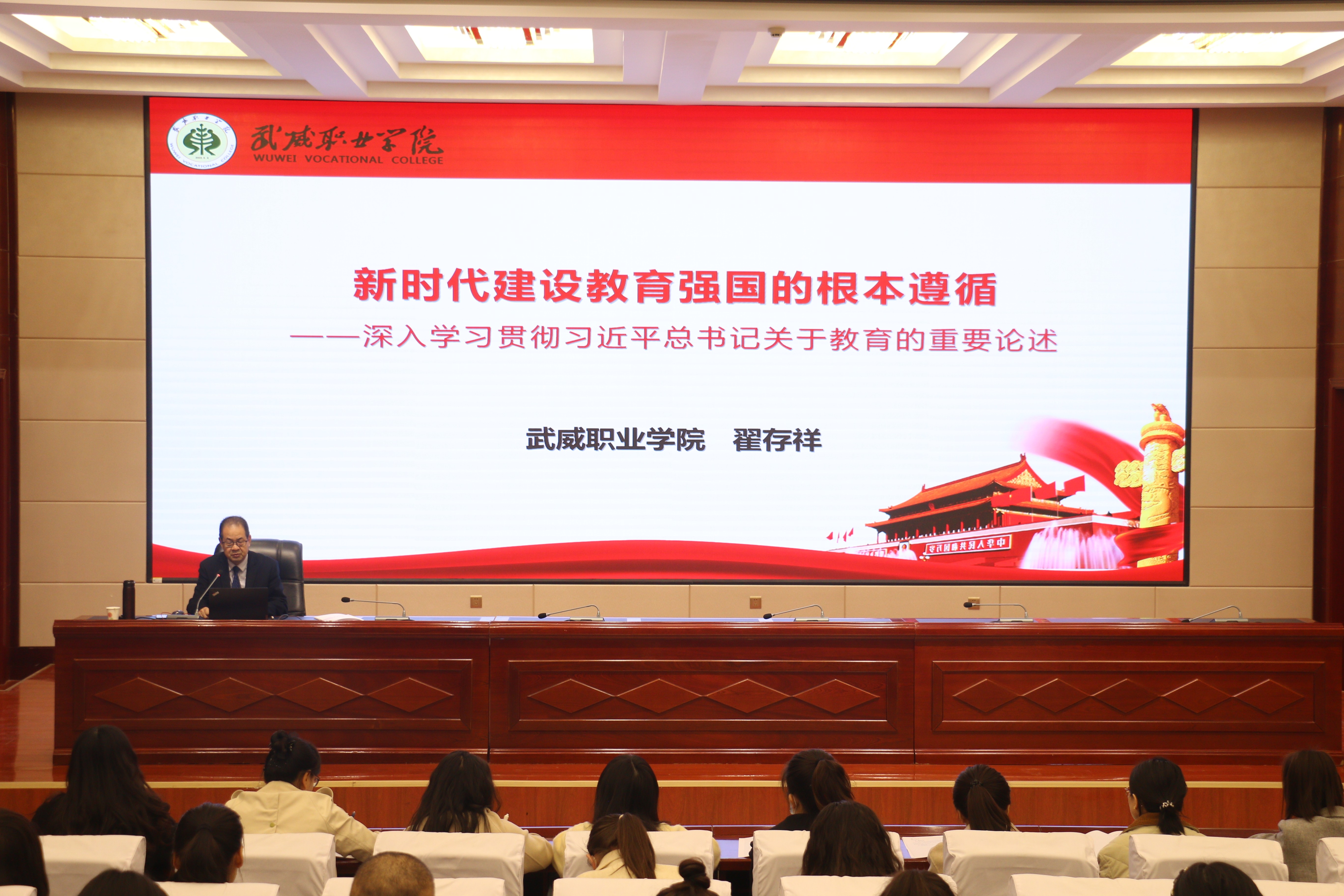 翟存祥代表全體師生對113名新教師成為武威職業(yè)學院大家庭的一員表示熱烈歡迎,并介紹了舉辦此次培訓班的目的。他指出,百年大計,教育為本;教育大計,教師為本;教師大計,師德為本。作為新時代的教師,不要辜負習近平總書記“奮斗創(chuàng)造奇跡、力量源于團結、希望寄予青年”的殷切希望。同時,他要求新教師要搞清楚“我是誰,從哪里來,到哪里去”;搞清楚我要“干什么、如何干、為誰干”。盡快站穩(wěn)三尺講臺,盡快融入職業(yè)教育,盡快融入這個大家庭,盡快成長為一名合格的、優(yōu)秀的人民教師,在教育教學崗位上立德立功立言。