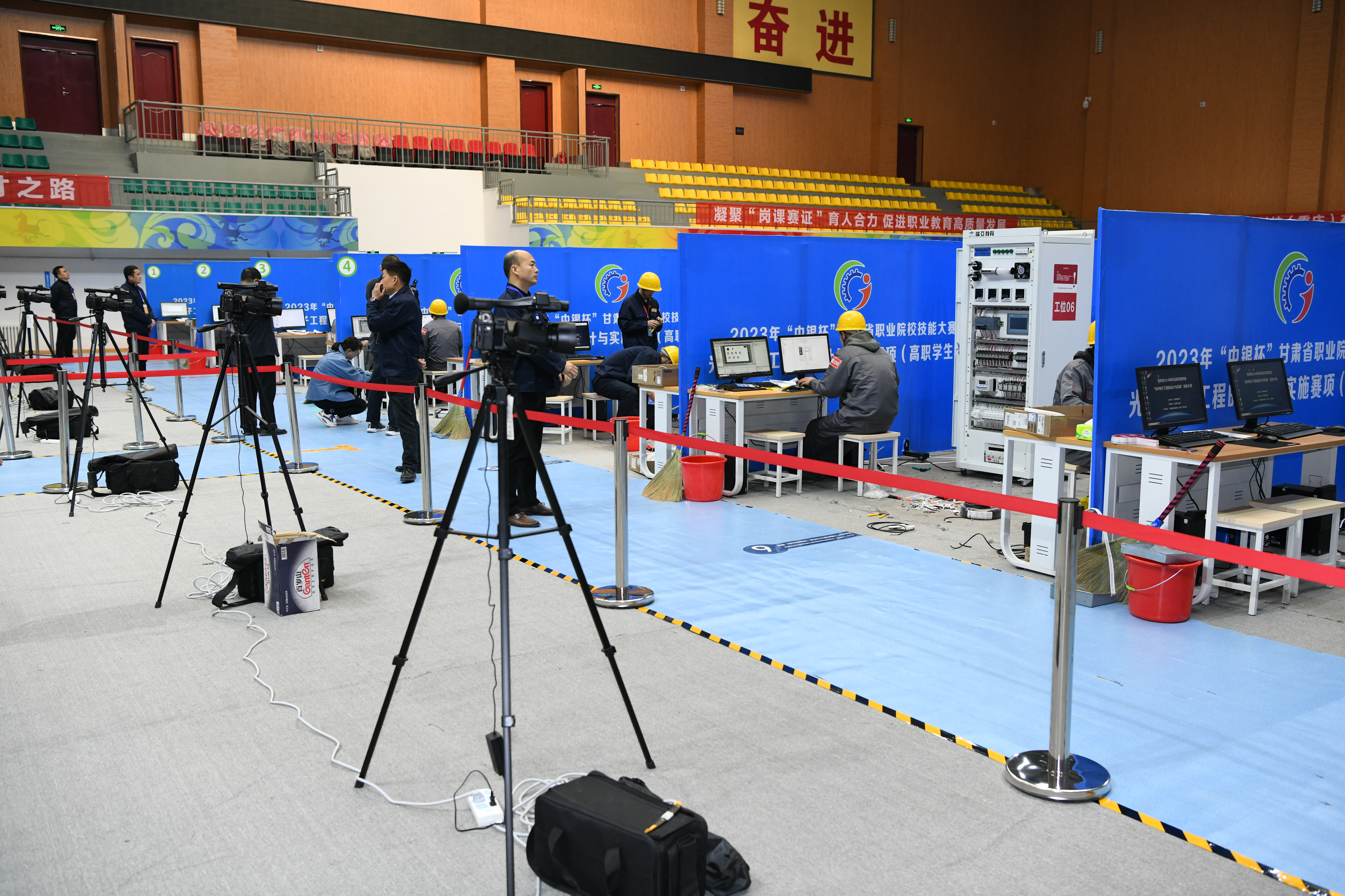 4月8日早上8:30,2023年“中銀杯”甘肅省職業(yè)院校技能大賽武威職業(yè)學(xué)院賽點(diǎn)開(kāi)賽儀式在學(xué)校菁英廳舉行。全省職業(yè)院校技能大賽監(jiān)督員、賽點(diǎn)仲裁工作組組長(zhǎng),蘭州資源環(huán)境職業(yè)技術(shù)大學(xué)黨委委員、副校長(zhǎng)謝軍武,全省職業(yè)院校技能大賽電子與信息大類首席專家、賽點(diǎn)仲裁工作組組員,酒泉職業(yè)技術(shù)學(xué)院新能源學(xué)院院長(zhǎng)馮黎成,武威市教育局黨組書(shū)記、局長(zhǎng)王娟,學(xué)校黨委書(shū)記、校長(zhǎng)趙明出席開(kāi)幕式。學(xué)校領(lǐng)導(dǎo)班子成員,各參賽學(xué)校領(lǐng)隊(duì)、參賽師生代表,裁判員代表,賽點(diǎn)組委會(huì)及各工作小組成員代表參加。開(kāi)賽儀式由學(xué)校黨委副書(shū)記翟存祥主持。