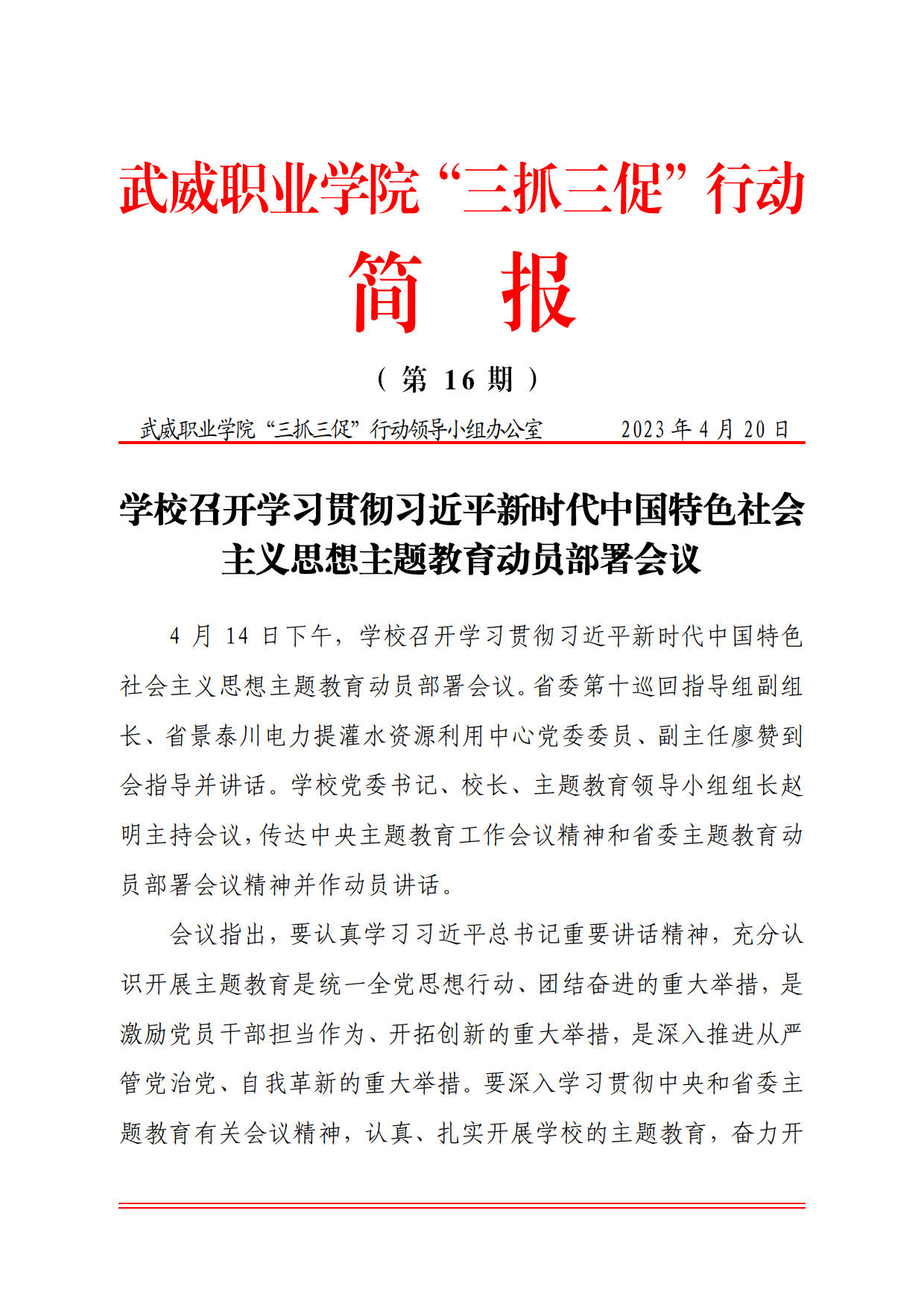 簡報第16期:學校召開學習貫徹習近平新時代中國特色 社會主義思想主題教育動員部署會議